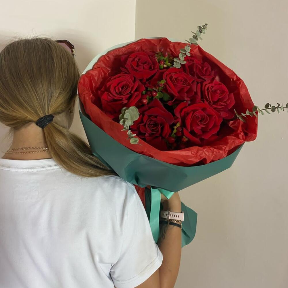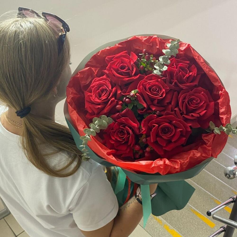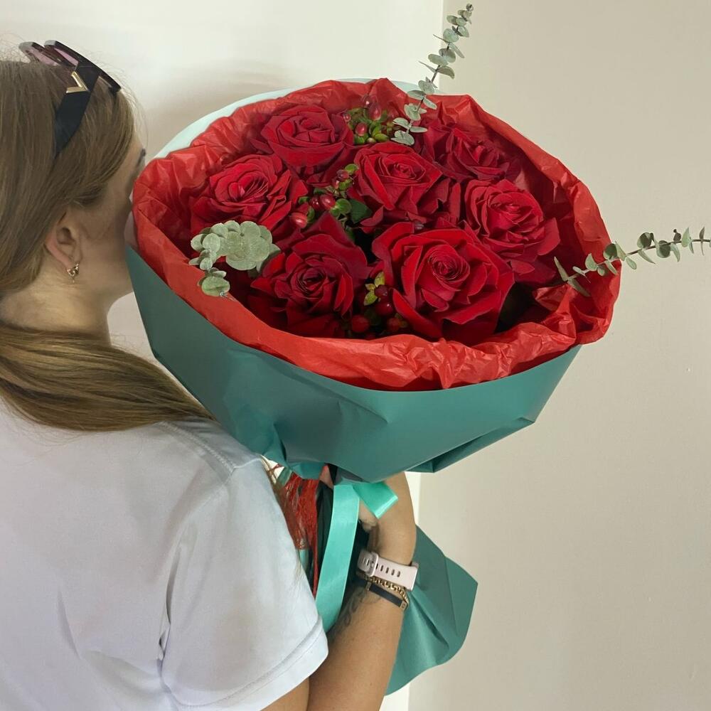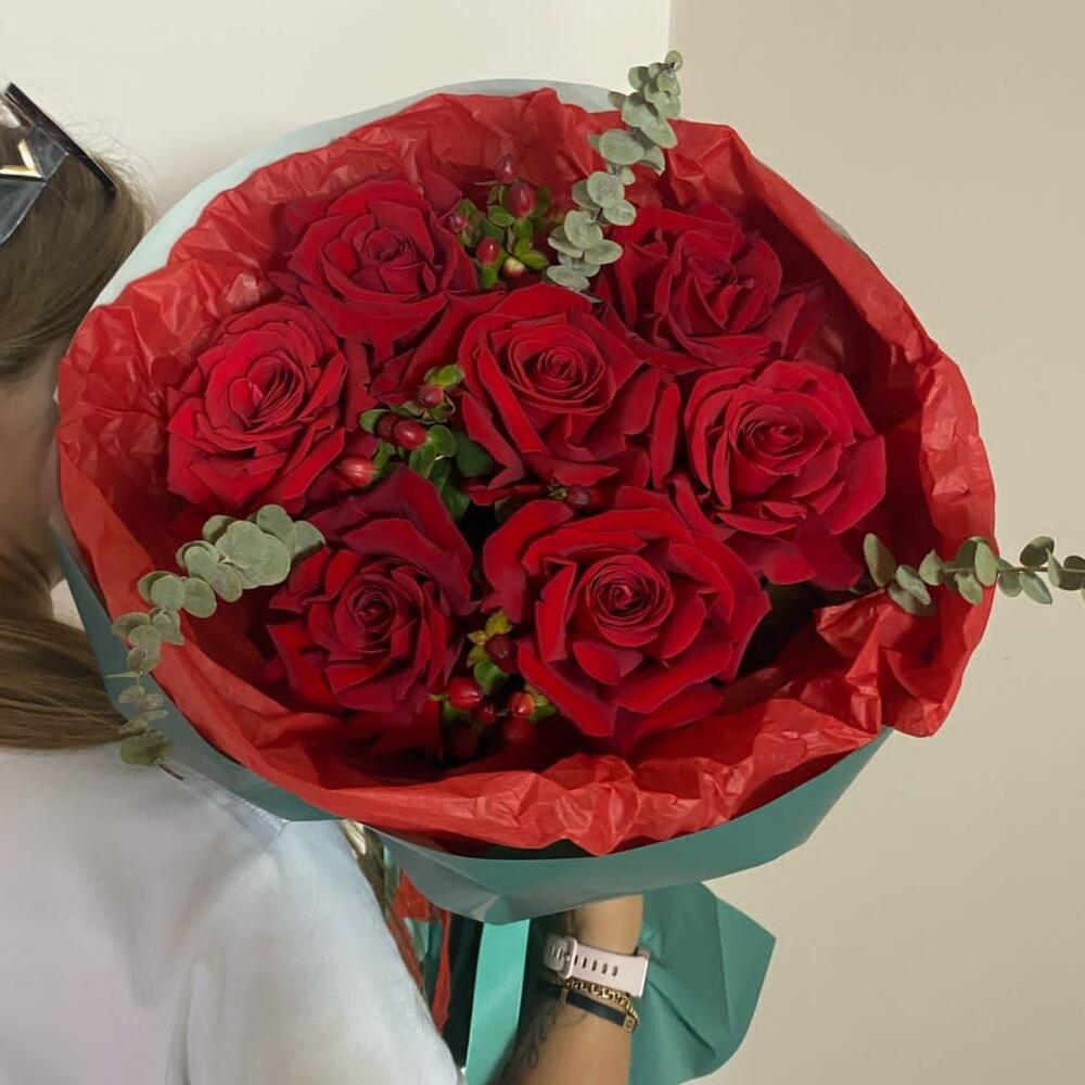 Гиперикум - 3 шт. Эвкалипт - 1 шт. Роза - 7 шт. Упаковка - 4 шт.