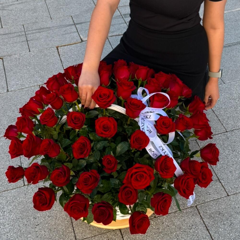 Шикарная корзина из 51 розы с зеленью