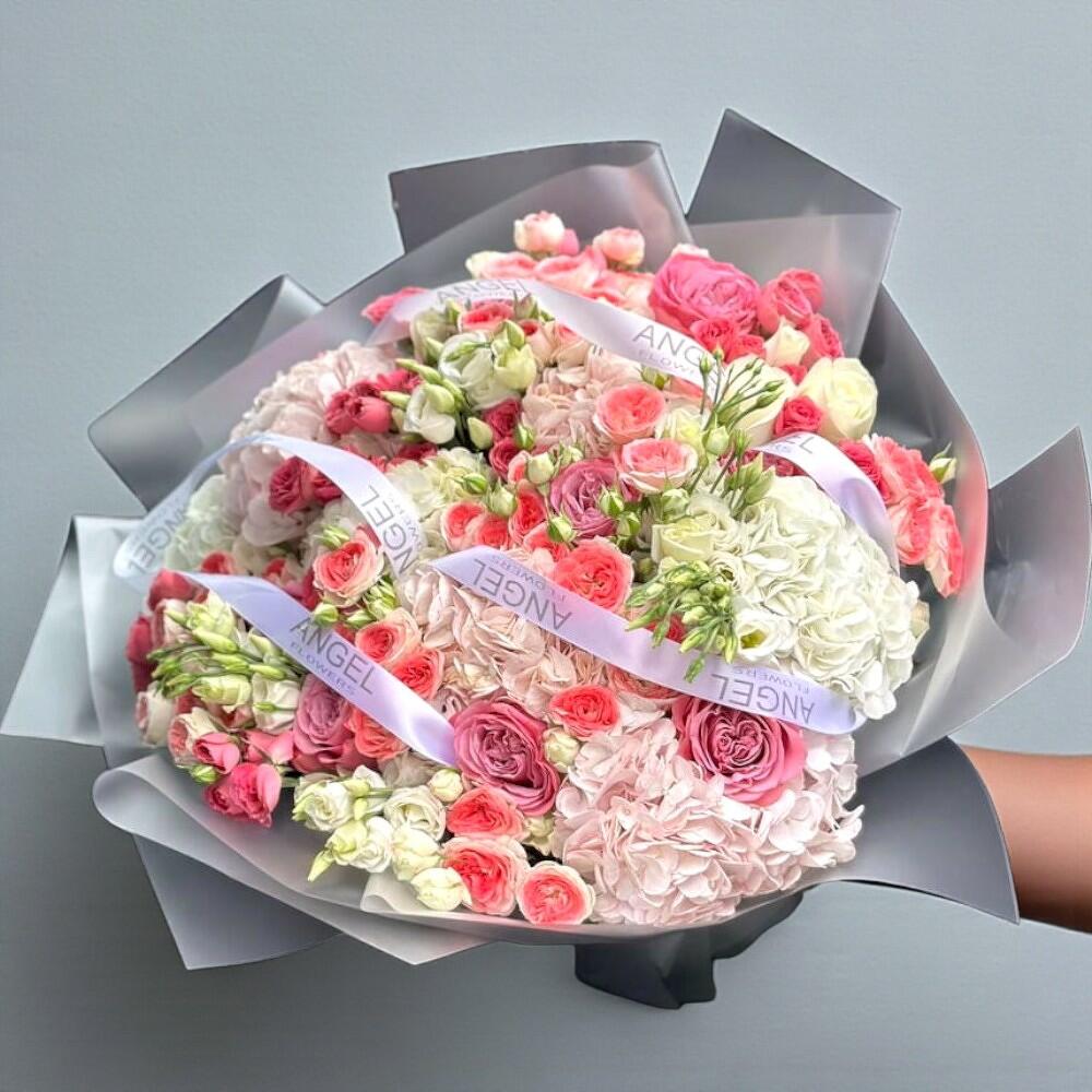 Этот авторский букет представляет собой эксклюзивное произведение флористического искусства. Букет украшен шестью пышными гортензиями, которые становятся еще чарующее в сочетании с пятнадцатью нежными розовыми розами. В композицию также входят пять эустом, придавающих букету изысканность и лоск. Необыкновенной красоты кустовая роза числится в количестве семи веток, а завершают цветочный ансамбль два роскошных ранункулуса. Этот букет станет идеальным подарком, который может внести яркие краски в любой праздник или важное событие. Чтобы букет дольше сохранял свежесть, рекомендуется ежедневно менять воду, срезать стебли под углом и держать его в прохладном месте, вдали от прямых солнечных лучей и сквозняков.