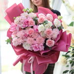 Лизиантус - 5 шт. Хризантема кустовая - 5 шт. Эвкалипт - 5 шт. Роза - 5 шт. Диантус - 5 шт.