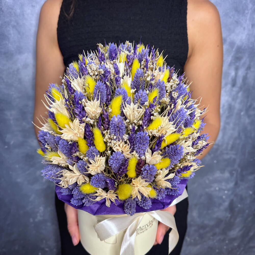 Лаванда - 30 шт. Лимониум - 5 шт. Коробка шляпная - 1 шт. Пшеница - 30 шт. Нигелла - 15 шт. Лагурус - 50 шт. Фаларис - 30 шт. Оазис флористический - 1 шт.