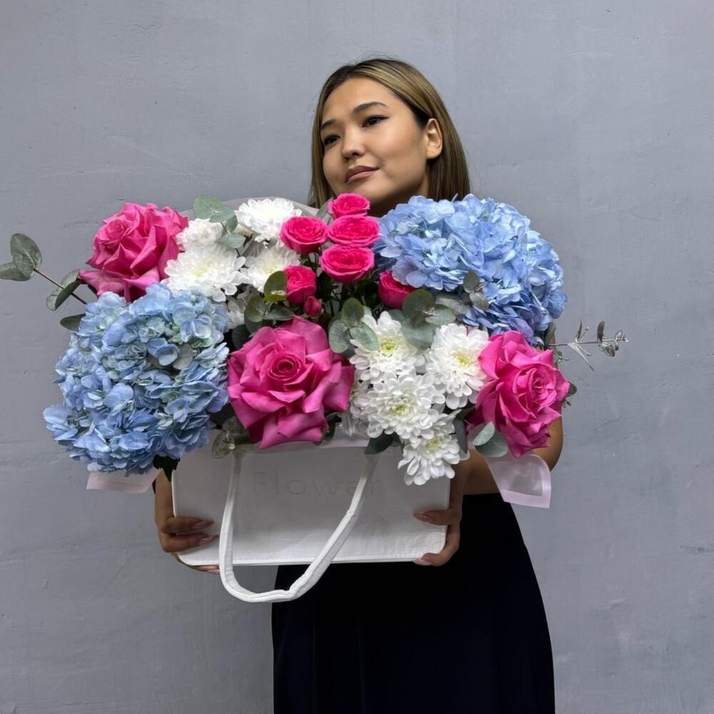 Гортензия - 2 шт. Хризантема кустовая - 2 шт. Французская роза - 2 шт. Эвкалипт Микс - 2 шт. шоппер - 1 шт. софия кустовая роза - 1 шт.