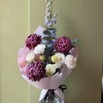 Дельфиниум - 1 шт. Эустома - 3 шт. Упаковка дизайнерская - 3 шт. Аквабокс - 1 шт. Эвкалипт Цинерея - 3 шт. бигуди хризантема одноголовая - 3 шт.