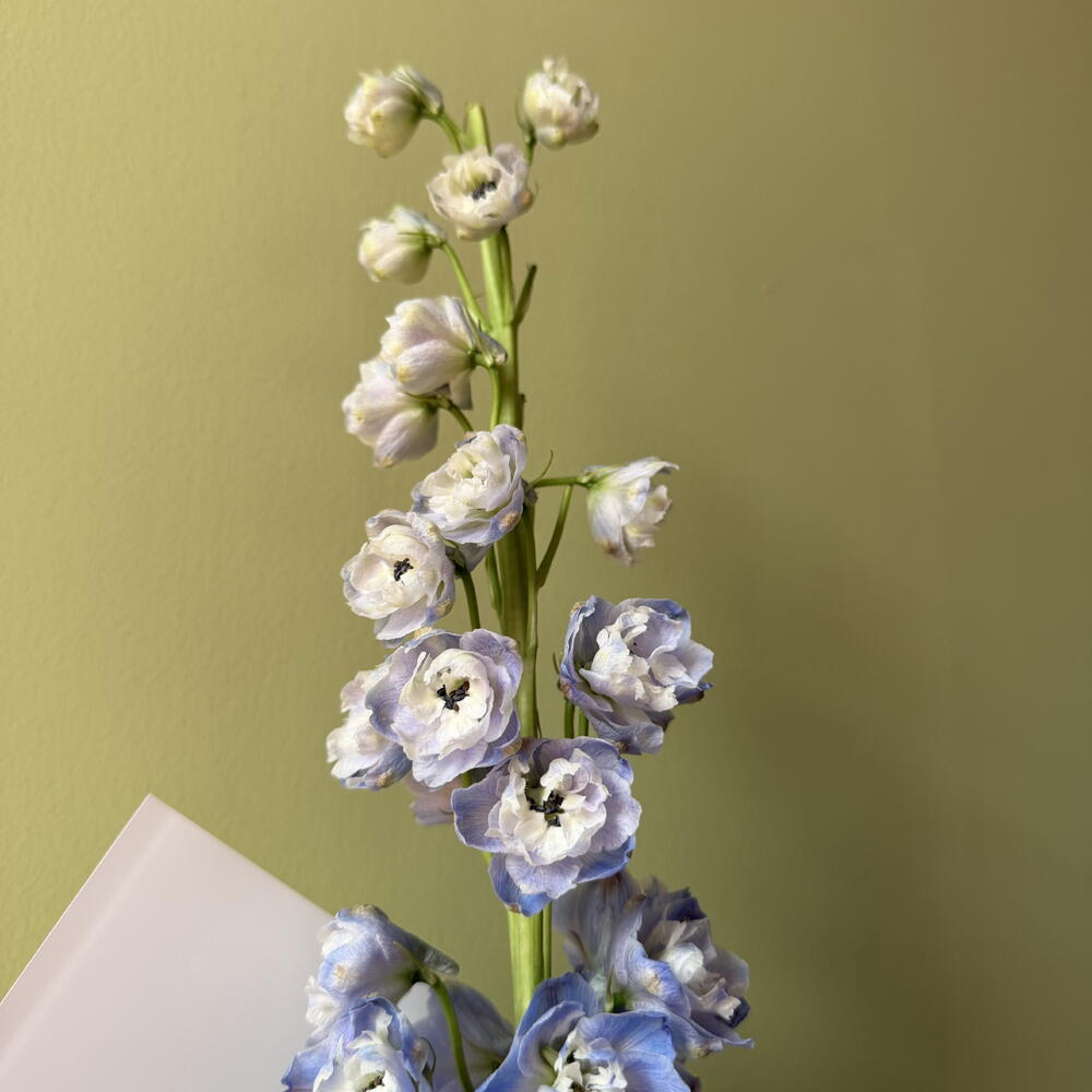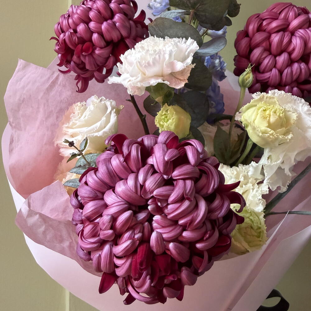 Дельфиниум - 1 шт. Эустома - 3 шт. Упаковка дизайнерская - 3 шт. Аквабокс - 1 шт. Эвкалипт Цинерея - 3 шт. бигуди хризантема одноголовая - 3 шт.