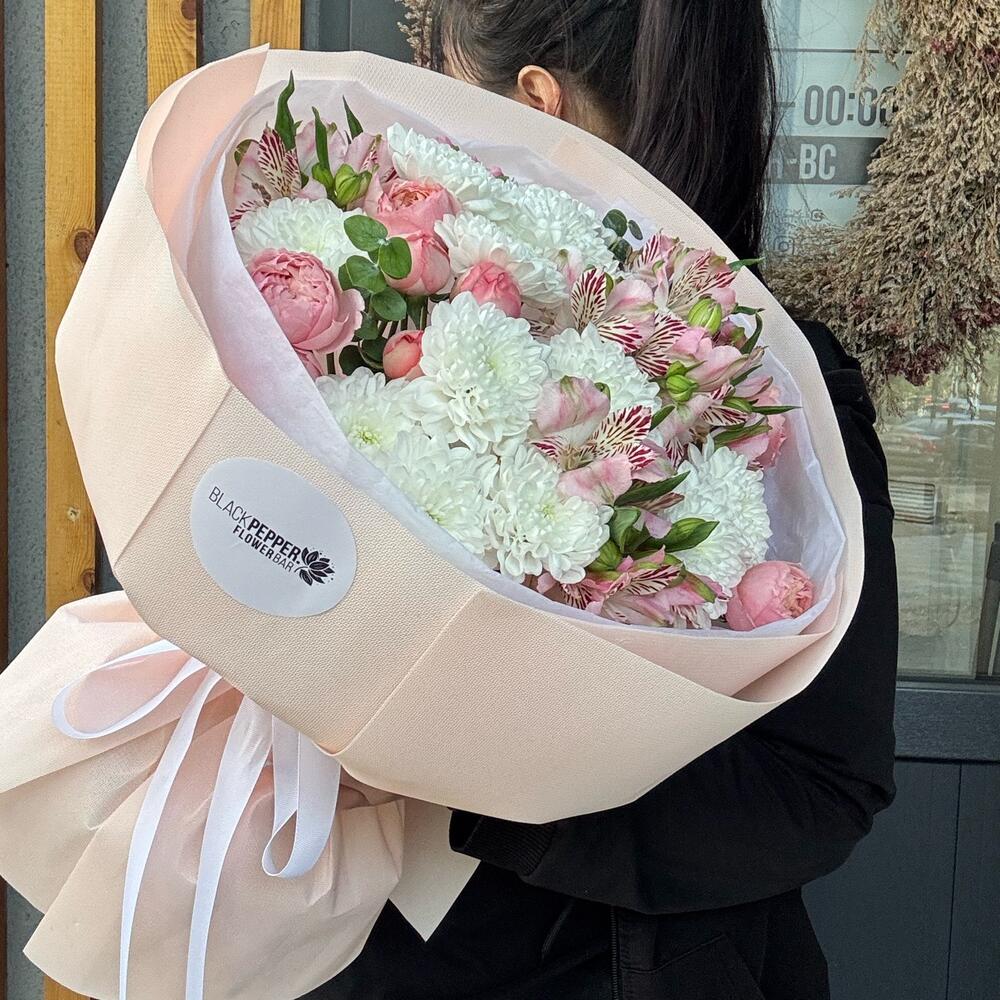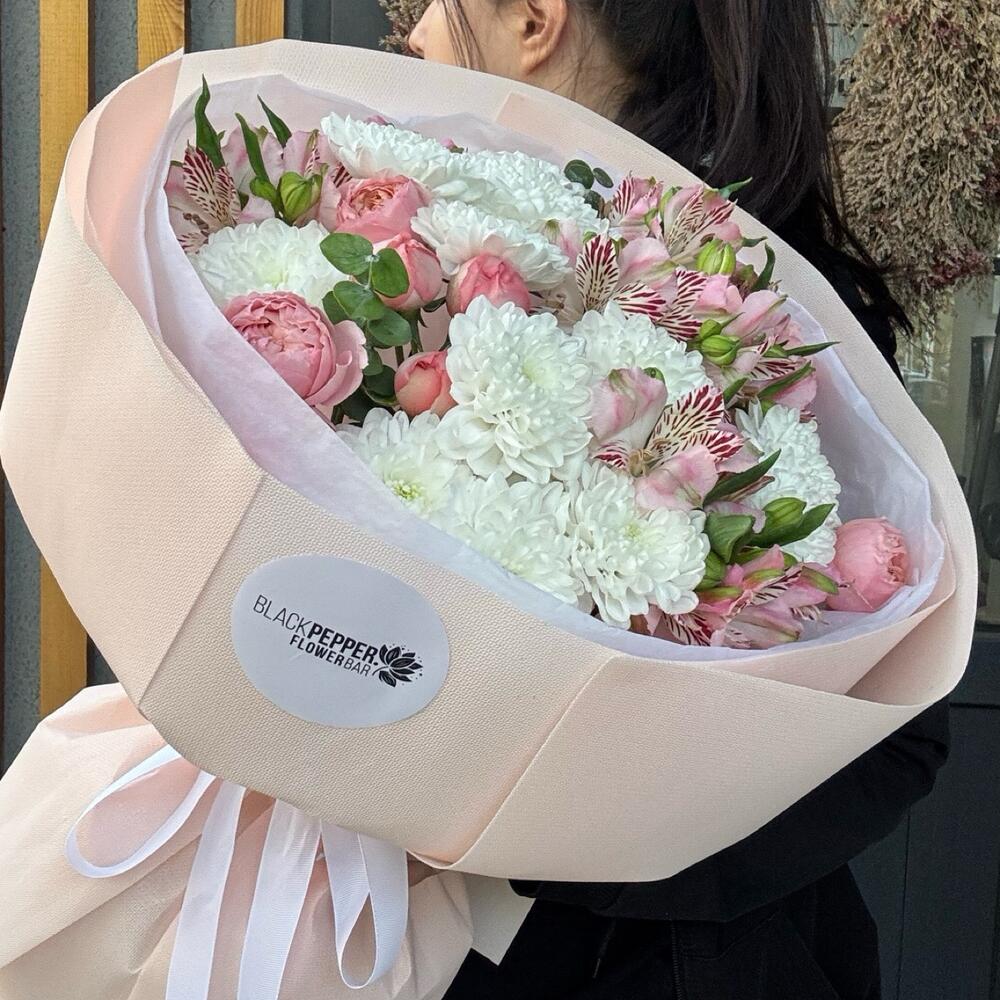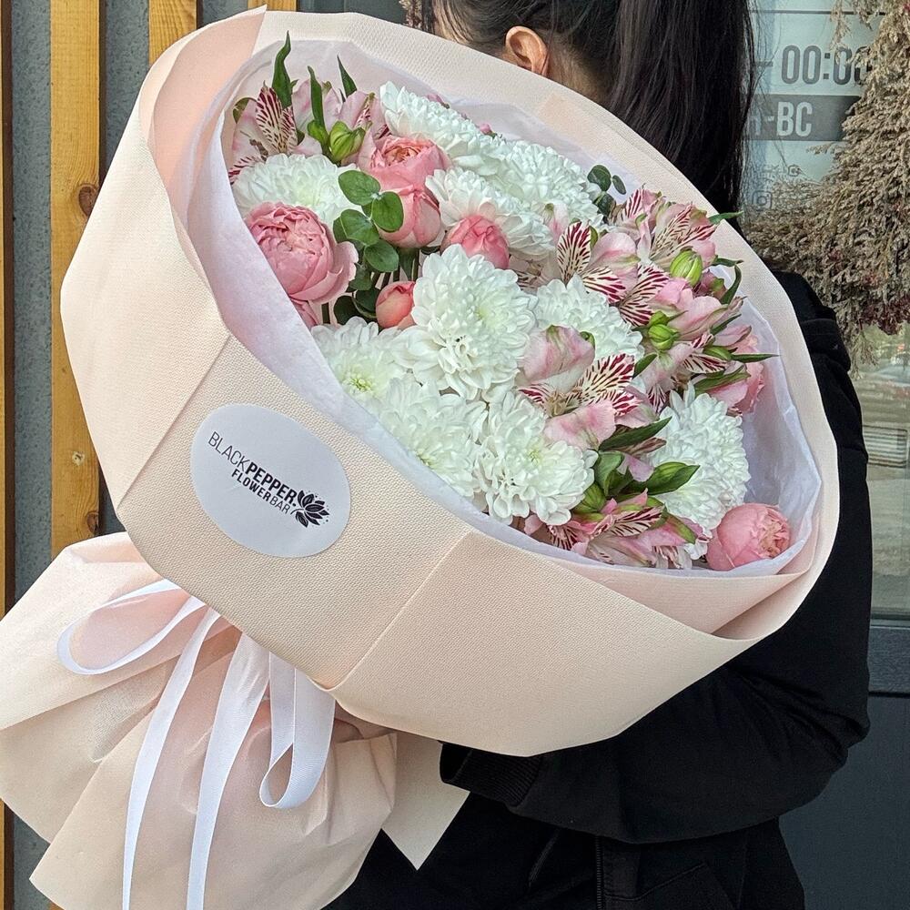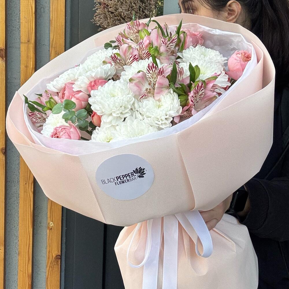 Альстромерия - 4 шт. Хризантема кустовая - 4 шт. Кустовая роза - 3 шт.