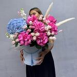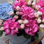 Гортензия - 1 шт. Маттиола - 2 шт. Кустовая роза - 7 шт. Сухоцветы - 3 шт. Коробка - 1 шт. Французская роза - 6 шт.
