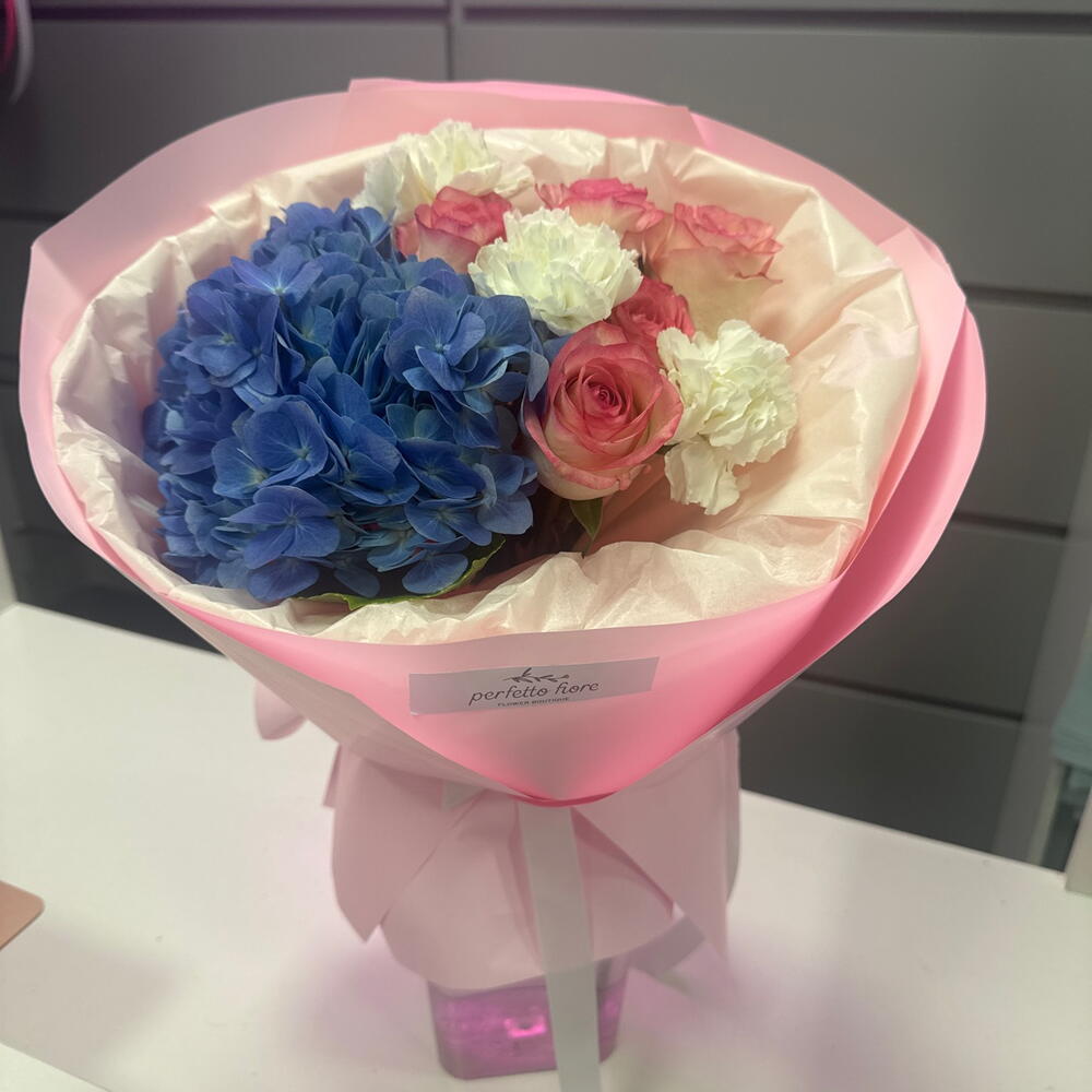 Этот изысканный авторский букет станет идеальным подарком для особенного человека. Дизайн собран из пяти пышных роз, добавляющих классического шарма, трех цветов диантуса, которые добавляют неповторимый акцент, а также одного цветка премиум микс гортензии, который придает букету уникальность и великолепие. Этот восхитительный букет будет радовать глаза и душу достойным образом.