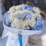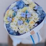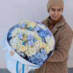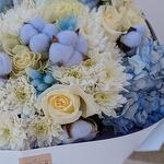 Нежный букет в голубой гамме с пионовидными розами и хлопком "Полярная звезда" L