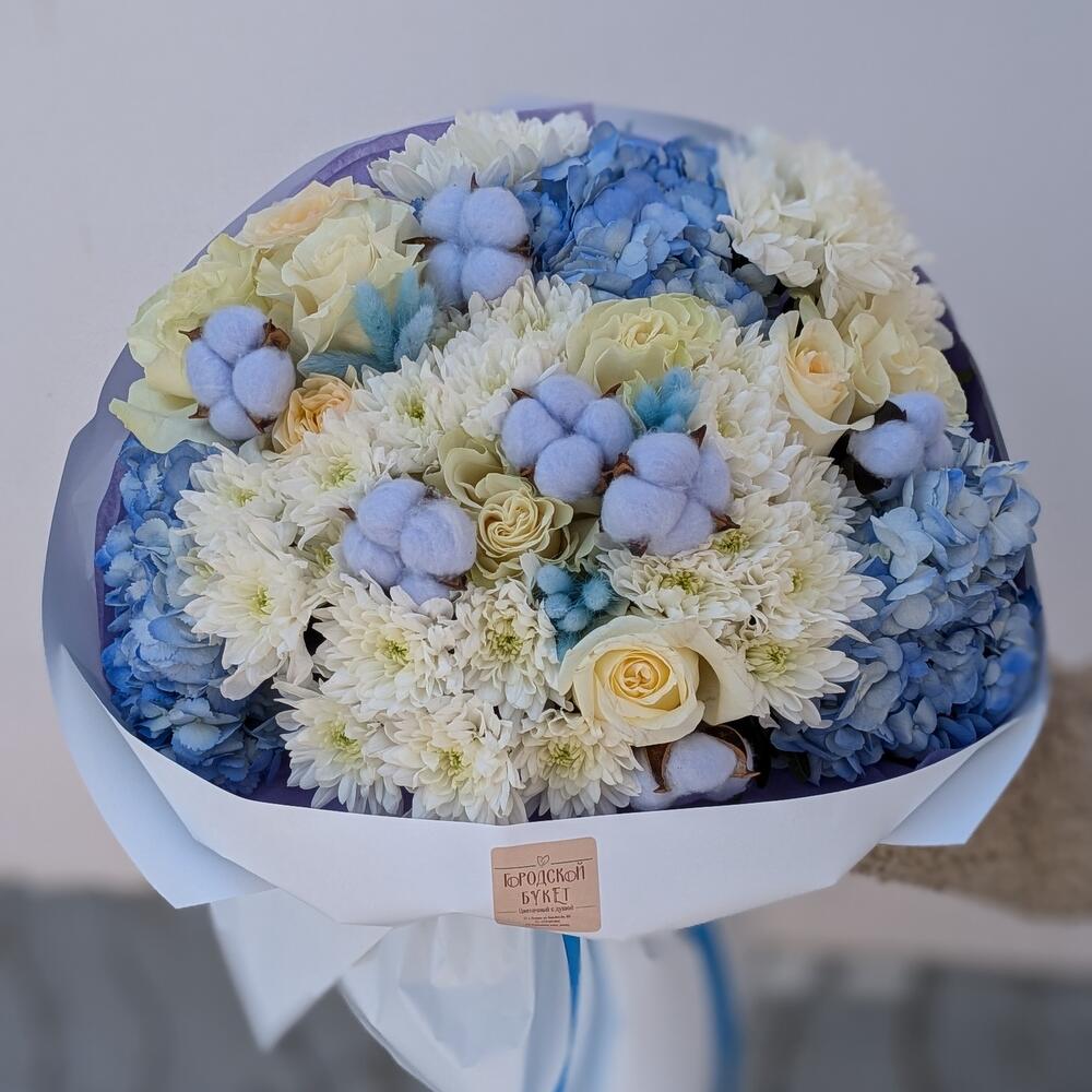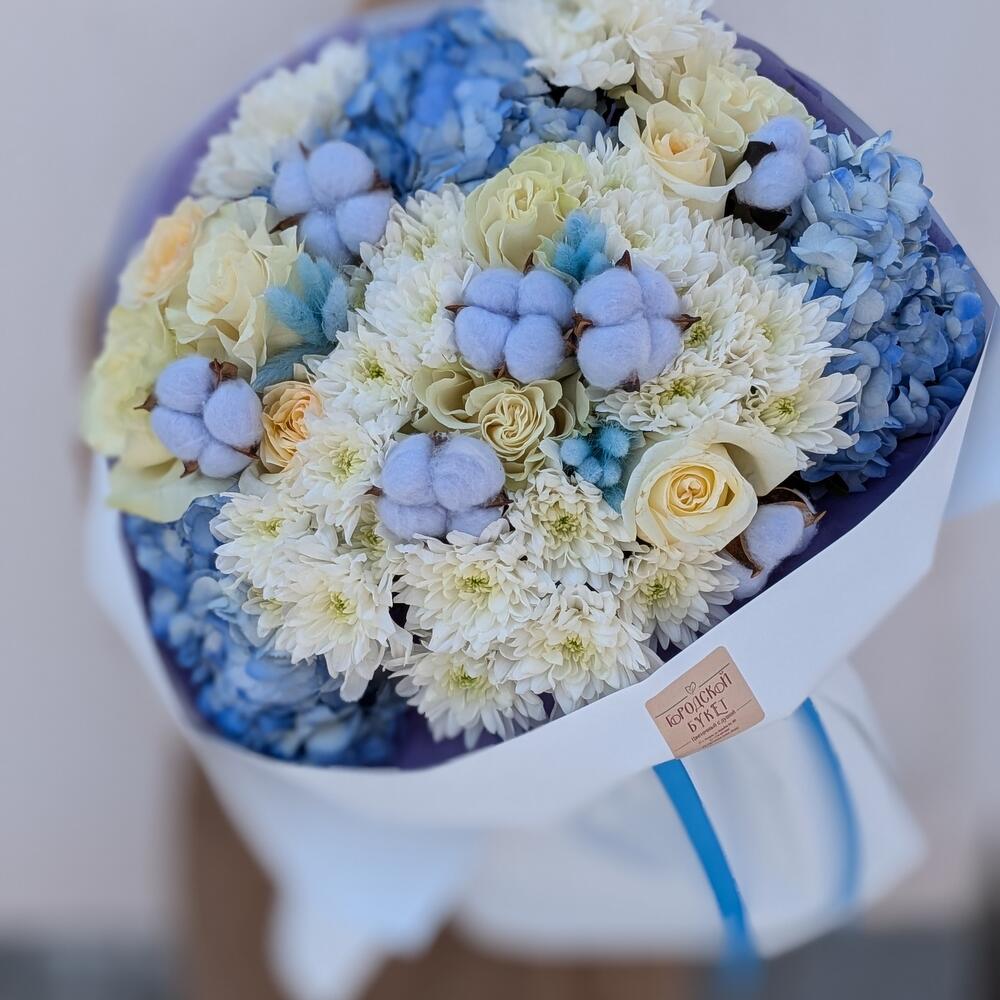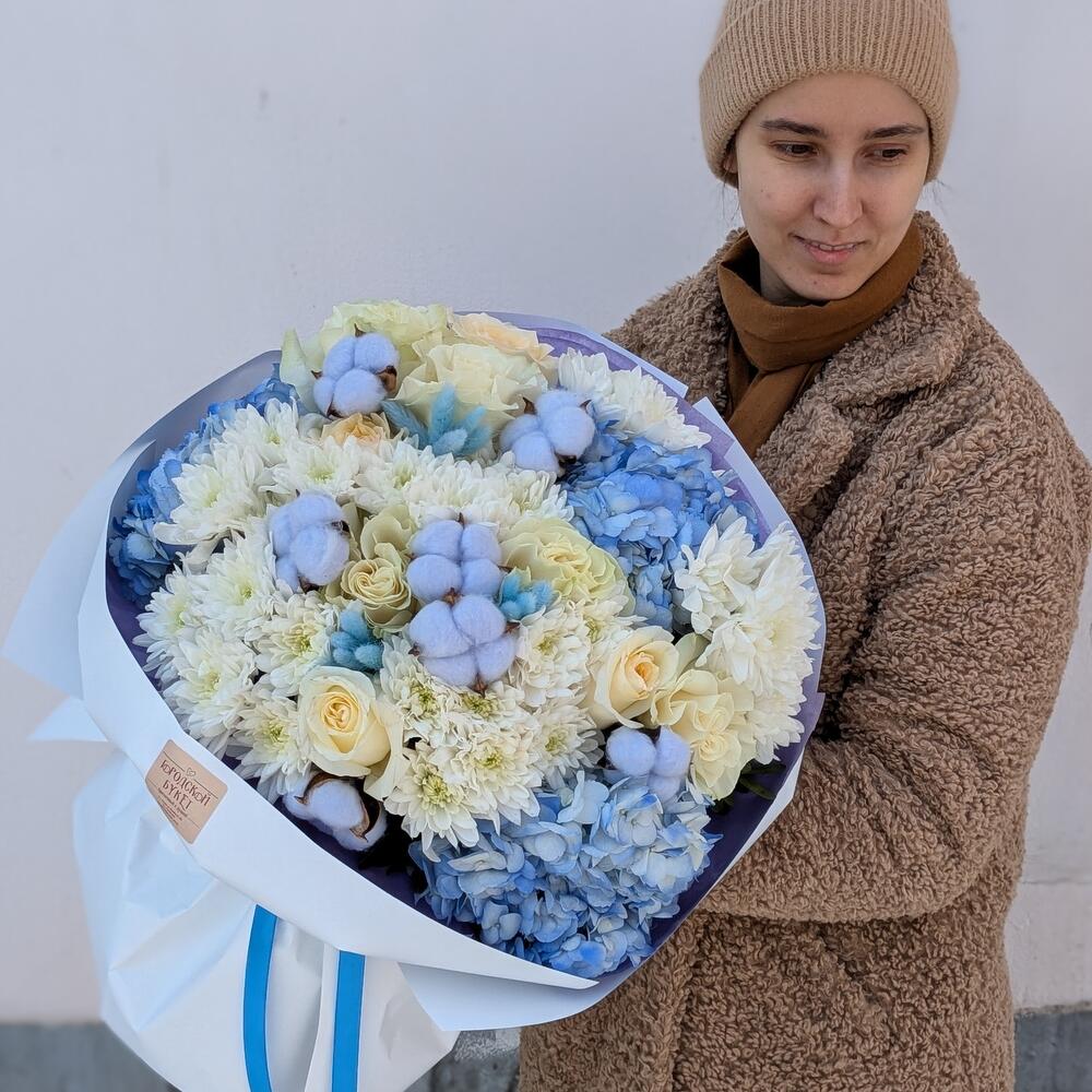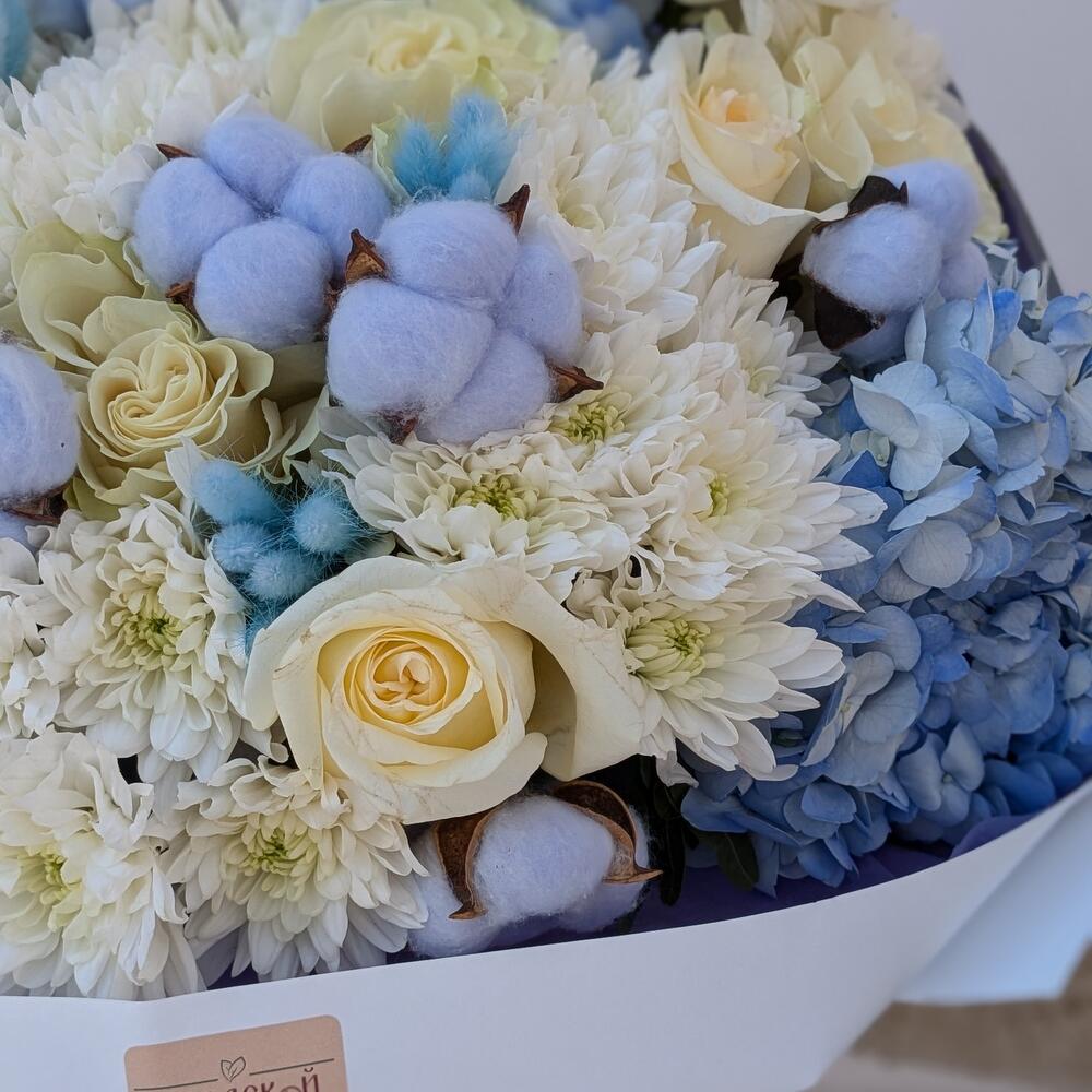 Нежный букет в голубой гамме с пионовидными розами и хлопком "Полярная звезда" L