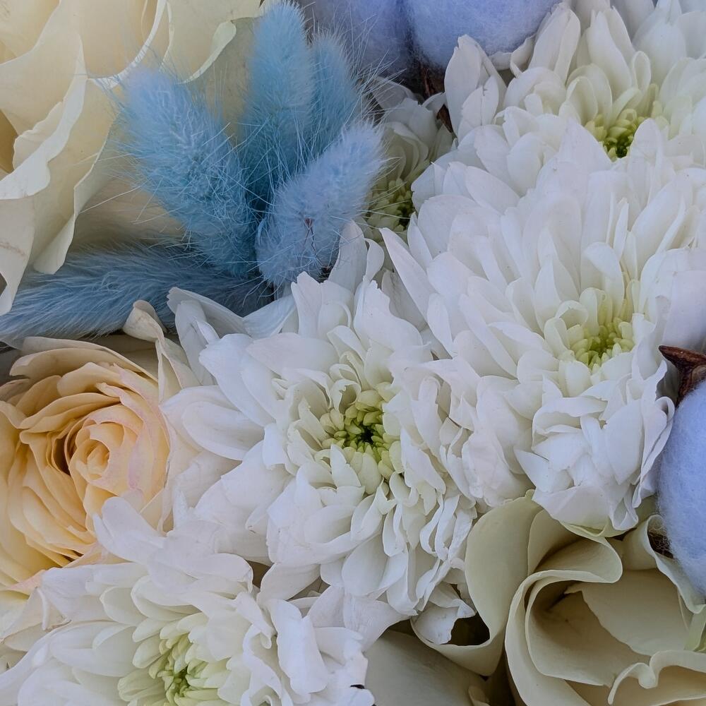 Гортензия - 3 шт. Хлопок - 7 шт. Хризантема кустовая - 7 шт. Роза - 9 шт. Лагурус (сухоцвет) - 15 шт.