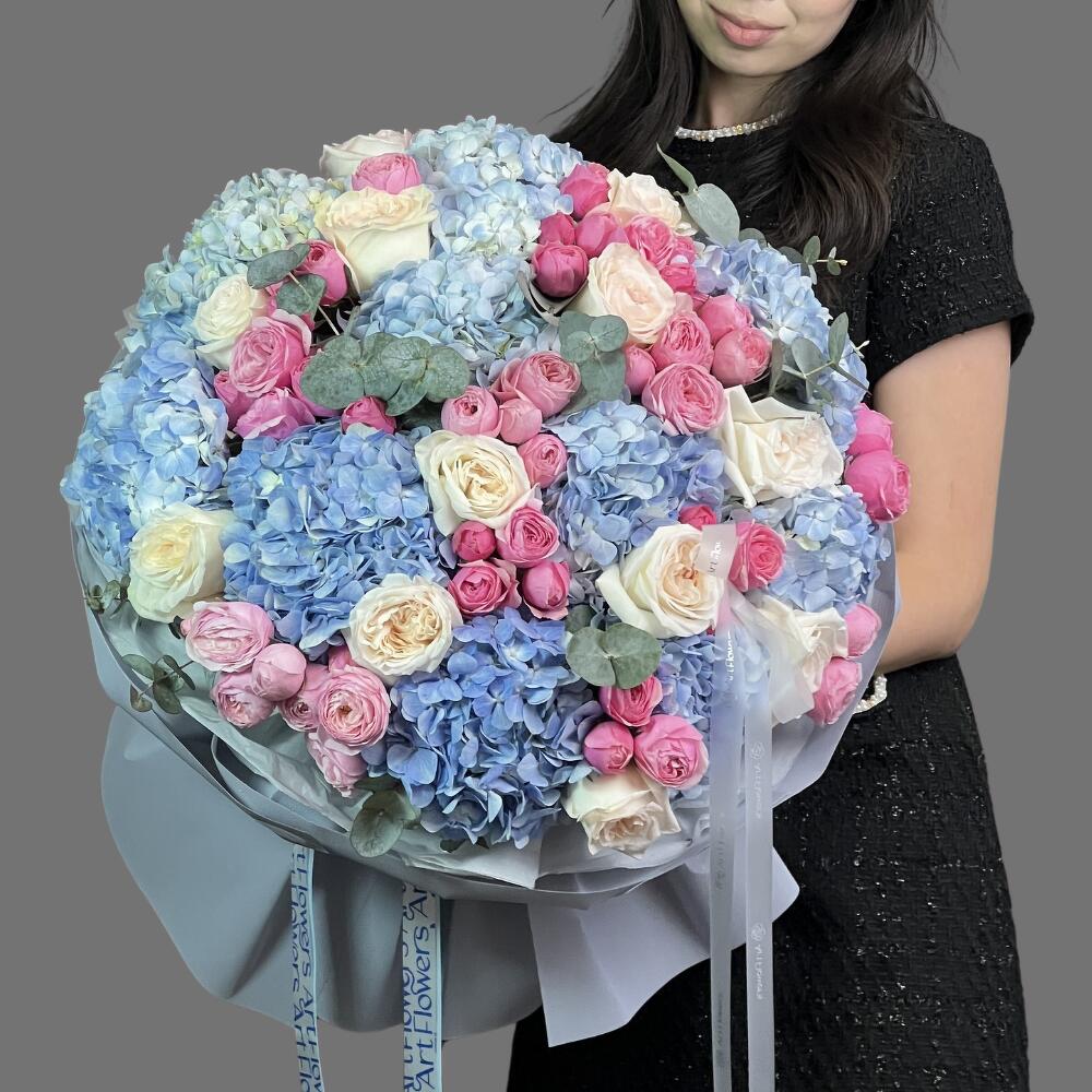 Воздушный ансамбль цветов в розово-голубых оттенках. Этот букет звучит, как мелодия лёгкости и романтики.