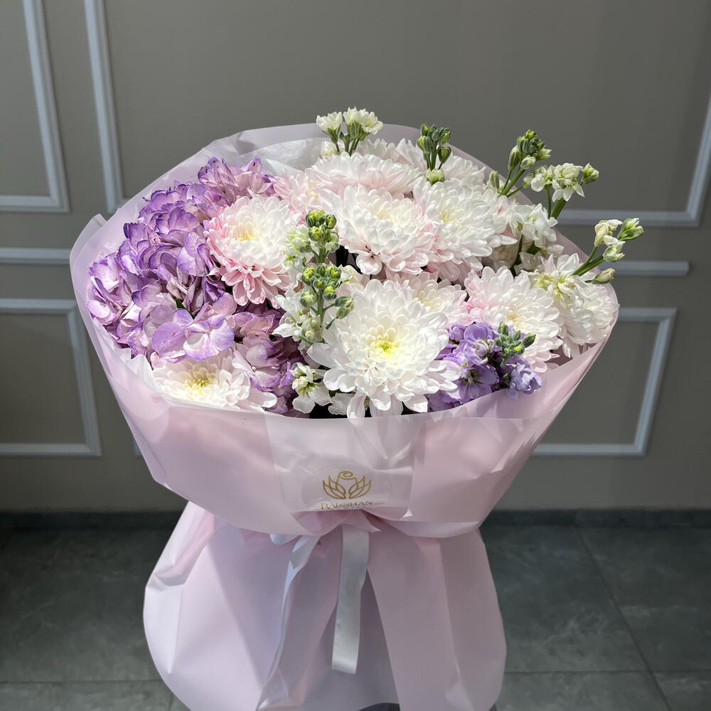 Гортензия - 1 шт. Маттиола - 3 шт. Хризантема кустовая - 3 шт.