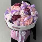Гортензия - 3 шт. Лента - 1 шт. Маттиола - 3 шт. Хризантема кустовая - 5 шт. Гвоздика - 3 шт. Хризантема одноголовая - 3 шт. Оформление - 1 шт.