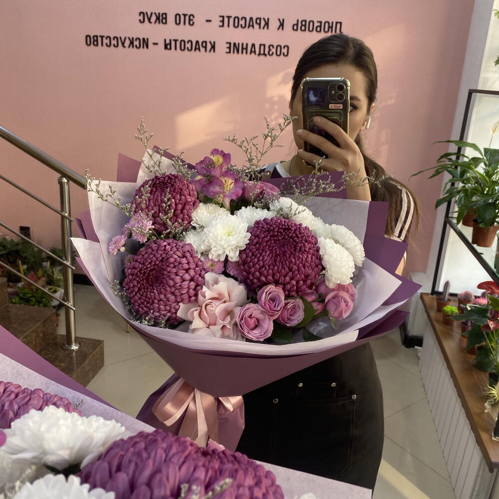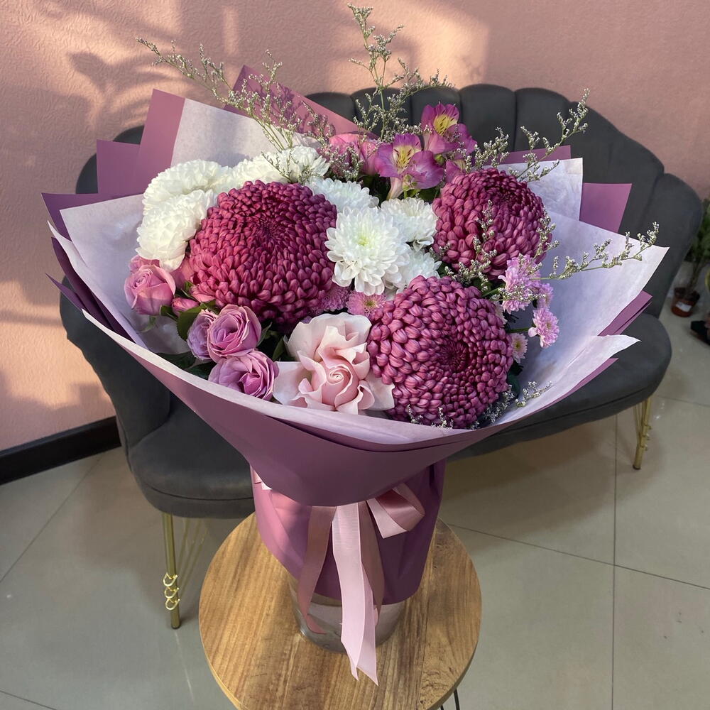 Пышный сборный букет в фиолетово-белой палитре — это сочетание изящества, глубины и лёгкой загадочности. Он создан для тех, кто любит букеты с характером: воздушные, многослойные и очень выразительные. В составе: • кустовые хризантемы — за объём и стойкость, • хризантемы бигуди — за необычную фактуру, • сантини — за свежесть и яркие акценты, • кустовые розы — за нежность и мягкость формы, • лимониум — за лёгкую дымку и утончённость, • французская роза — как главный штрих элегантности. Фиолетовые оттенки добавляют глубины и загадочности, а белые — чистоты и светлого настроения. В итоге букет получается не просто красивым, а впечатляющим и запоминающимся, идеально подходящим для важного события, поздравления или неожиданного сюрприза. Стойкость букета высокая — хризантемы сохраняют свежесть до 10–12 дней при правильном уходе, а лимониум становится сухоцветом. Заказывайте букет от Виновники flowers — потому что эмоции должны быть красивыми🌷
