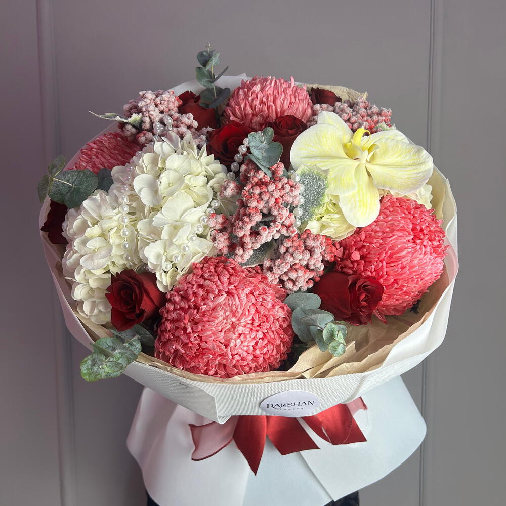 Гортензия - 2 шт. Сухоцветы - 3 шт. Хризантема одноголовая - 4 шт. Эвкалипт Цинерея - 1 шт. Орхидеи - 1 шт. розы - 7 шт.