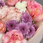 Гортензия - 1 шт. Хризантема - 2 шт. Пионовидная роза - 2 шт. Оформление - 1 шт. кустовая роза джульетта - 2 шт. гвоздики - 1 шт. роза 50с м - 3 шт.