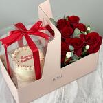 Эвкалипт - 1 шт. Кустовая гвоздика - 1 шт. Голландская роза - 9 шт. бенто торт - 1 шт.
