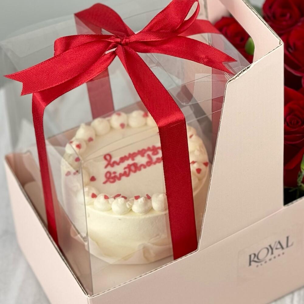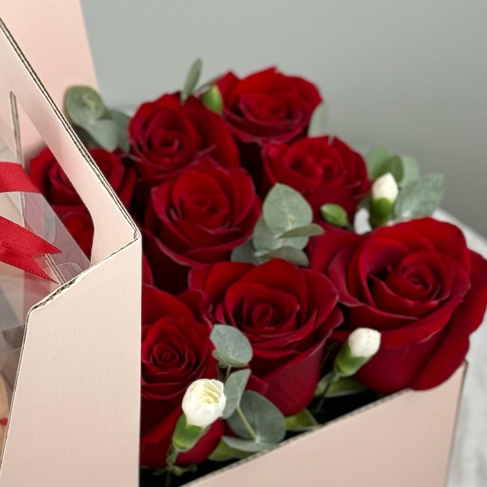 Эвкалипт - 1 шт. Кустовая гвоздика - 1 шт. Голландская роза - 9 шт. бенто торт - 1 шт.