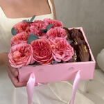 Эвкалипт - 1 шт. Пионовидная роза - 9 шт. бокс переноска - 1 шт. мадлены - 6 шт.