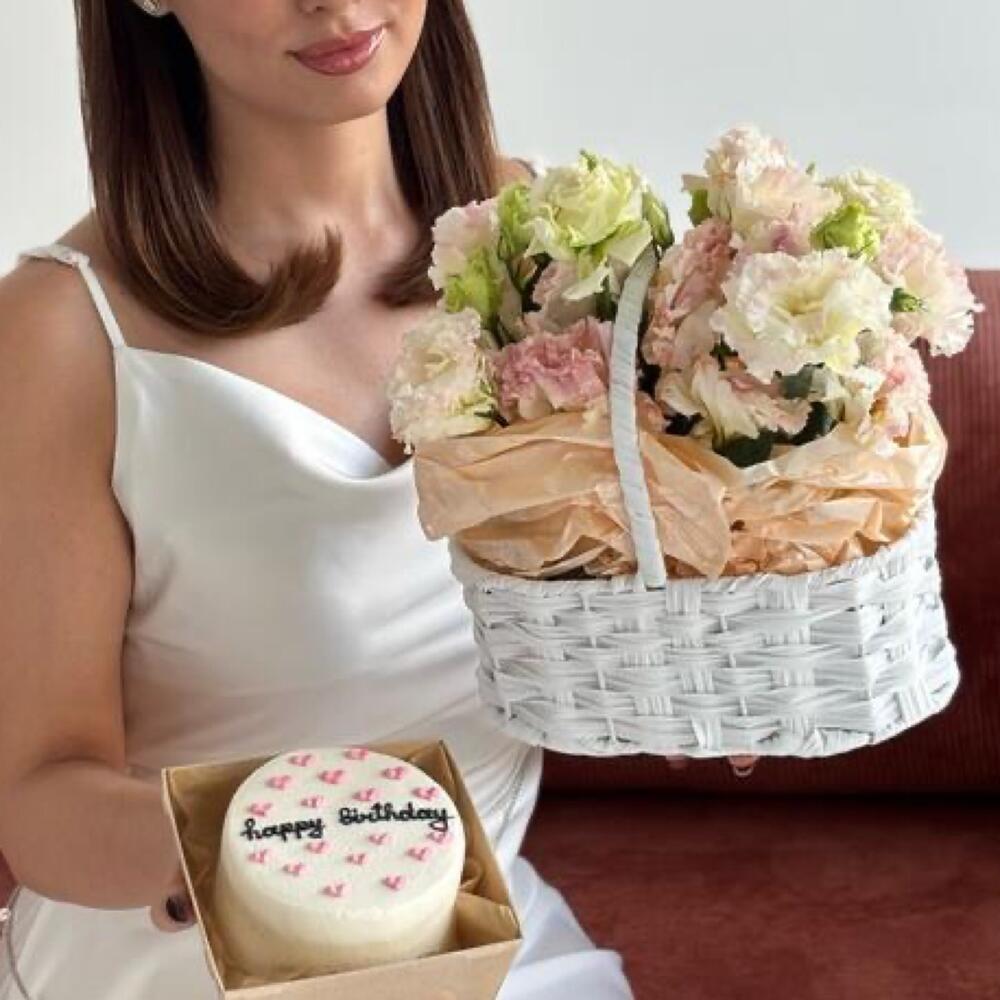 Очаровательная композиция в плетёной корзинке, наполненная воздушными цветами в пастельных тонах — сочетание кремово-розовых и лаймовых оттенков создаёт ощущение лёгкости и уюта. Дополняет образ мини-тортик с надписью Happy Birthday — символ тёплого и трепетного поздравления. Идеальный подарок, когда хочется сказать «ты особенная» — с любовью, нежностью и вкусом.