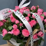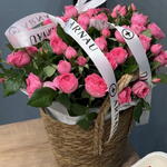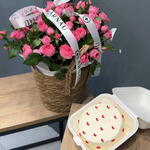 Комбо из нежных кустовых роз в стильной корзине и изысканного бенто-торта. Идеальное сочетание цветов и сладкого комплимента для создания тёплого настроения и улыбок.