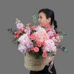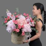 Гортензия - 4 шт. Корзина - 1 шт. Маттиола - 5 шт. Эвкалипт - 1 шт. Кустовая роза - 8 шт.