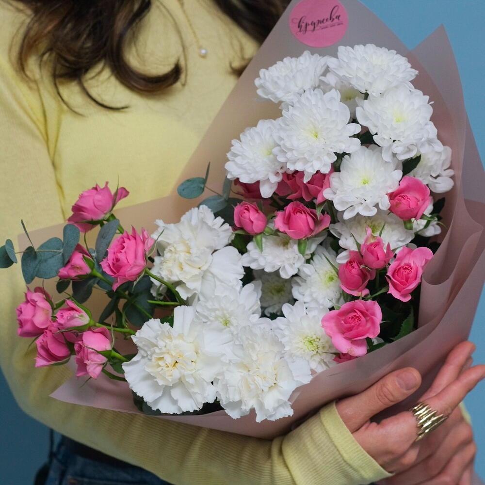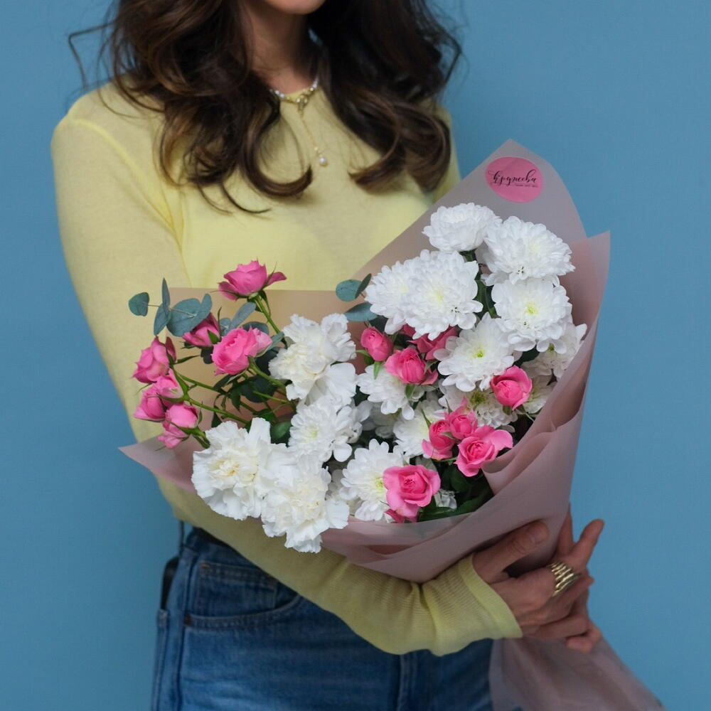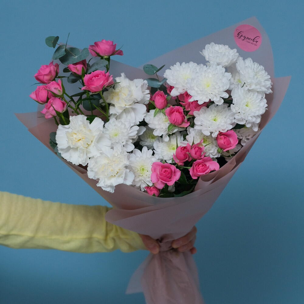 Хризантема кустовая - 2 шт. Гвоздика - 3 шт. эвкалипт cineria - 1 шт. софи кустовая роза - 3 шт.