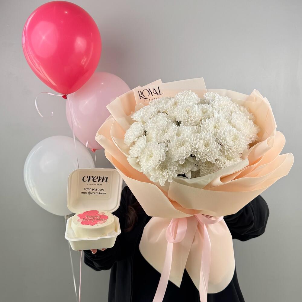 Оформление - 1 шт. Шары гелиевые - 3 шт. хризантемы кустовые - 7 шт. бенто торт с вашей надписью - 1 шт.