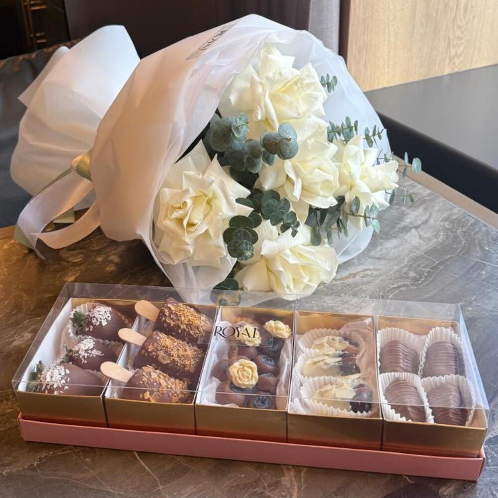 Роза - 5 шт. Банан - 3 шт. Клубника в шоколаде - 3 шт. Голубика 100гр - 10 шт. финики в шоколаде - 6 шт.