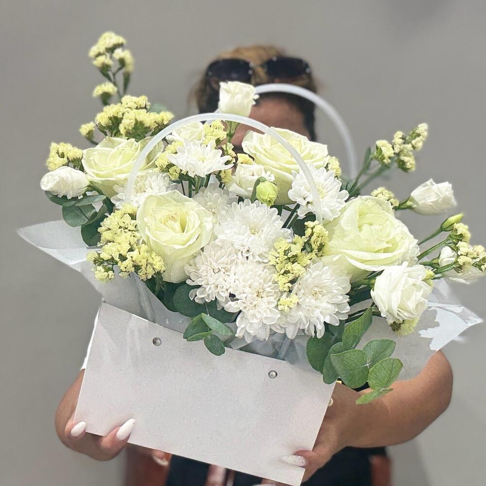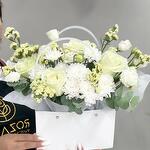 Статица - 3 шт. Хризантема кустовая - 1 шт. Сумка картон - 1 шт. Оазис флористический - 1 шт. эустома белая - 2 шт. Эвкалипт Baby Blue - 4 шт. розы белые эквадор - 4 шт.