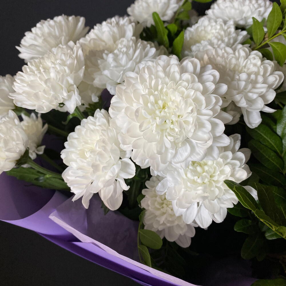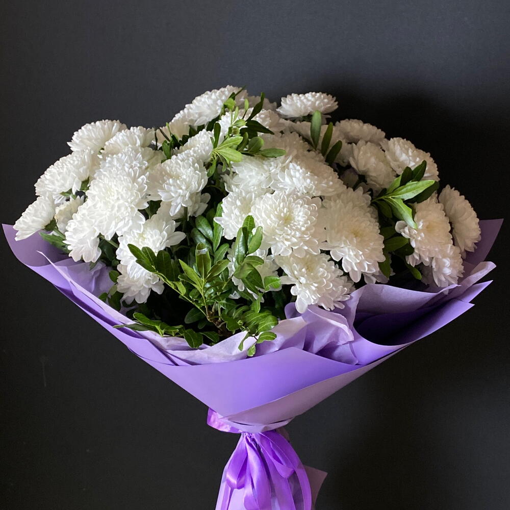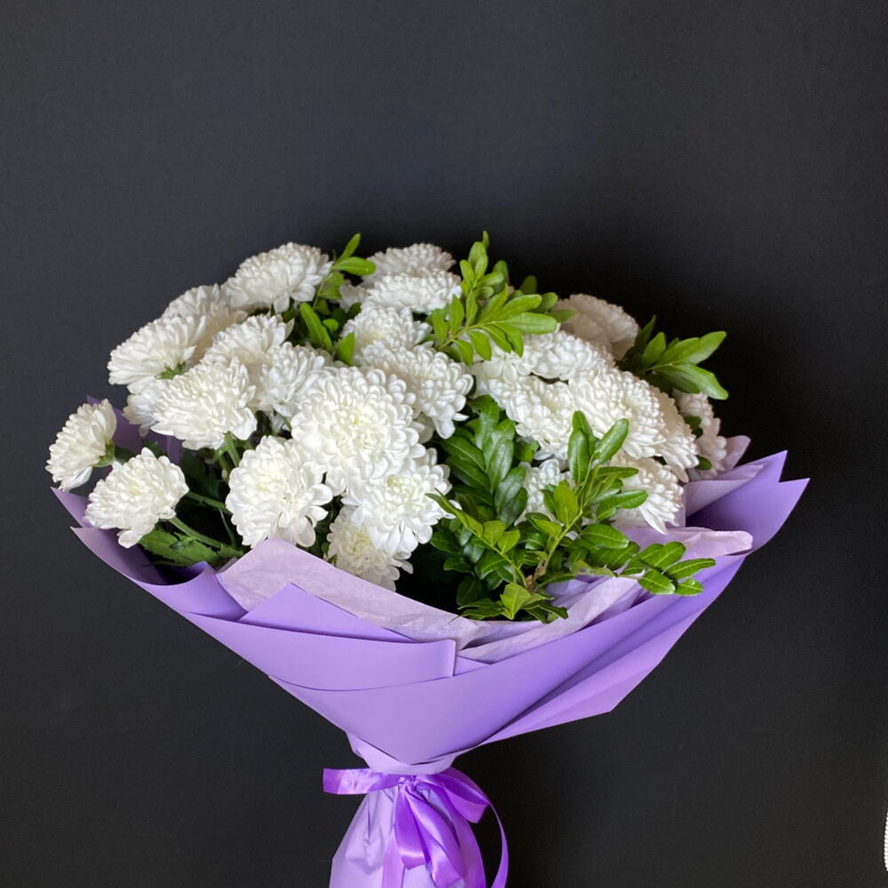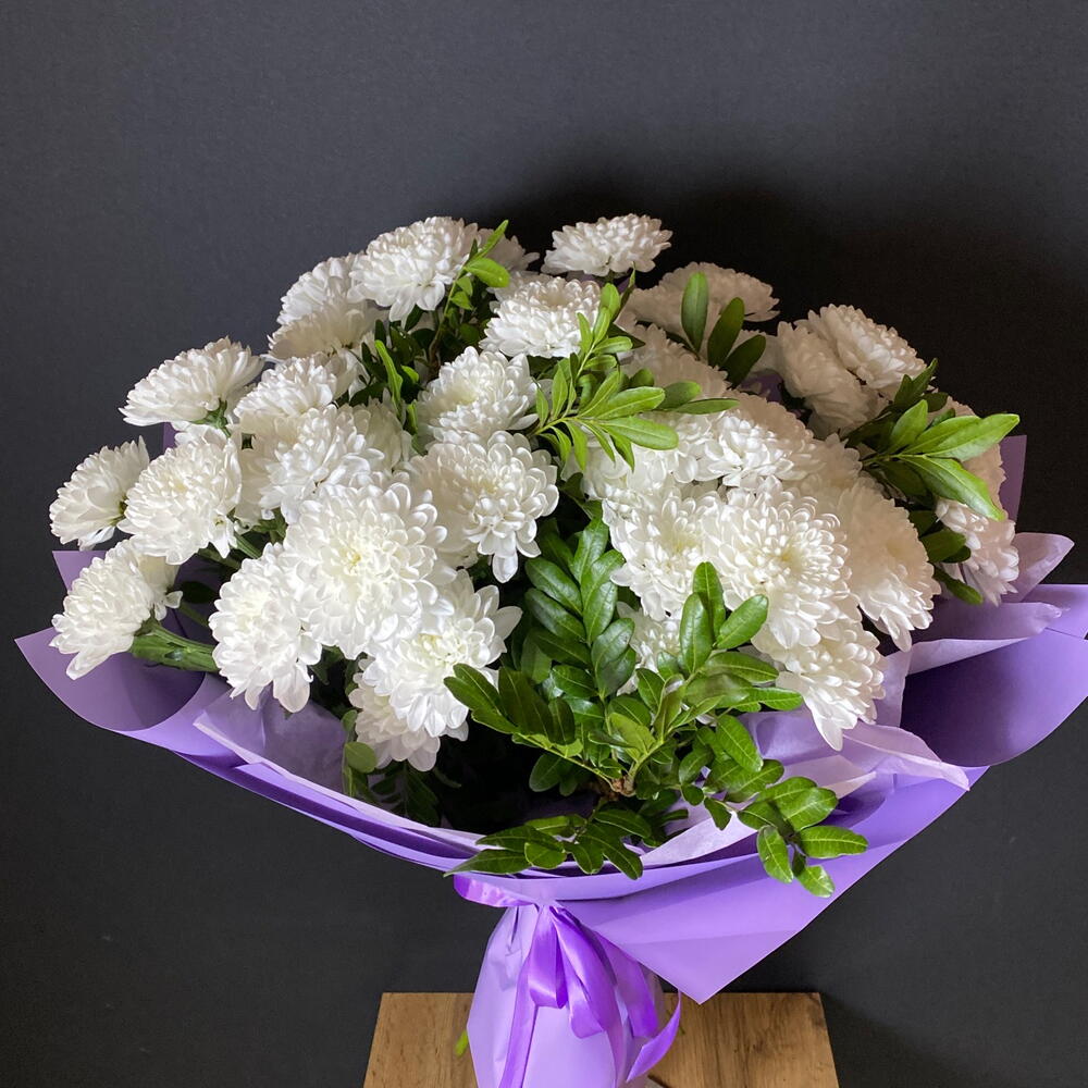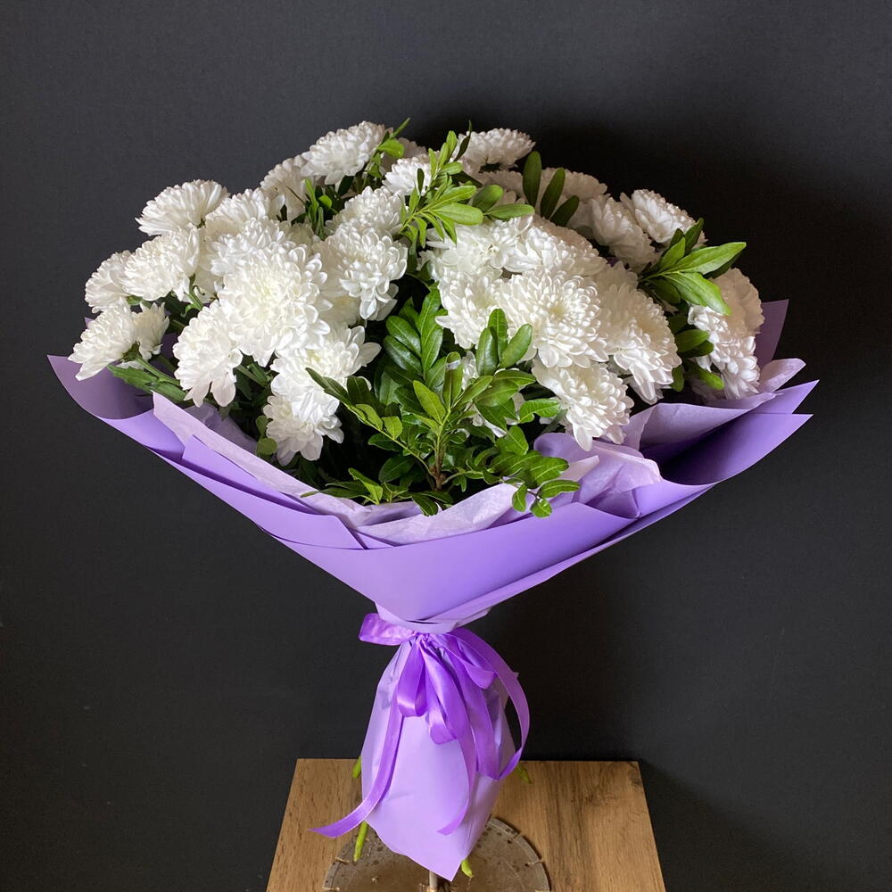 Хризантема кустовая - 7 шт. Фисташка - 2 шт. Оформление матовая пленка - 1 шт. открытка с вашими пожеланиями - 1 шт. утеплитель букета - 2 шт.
