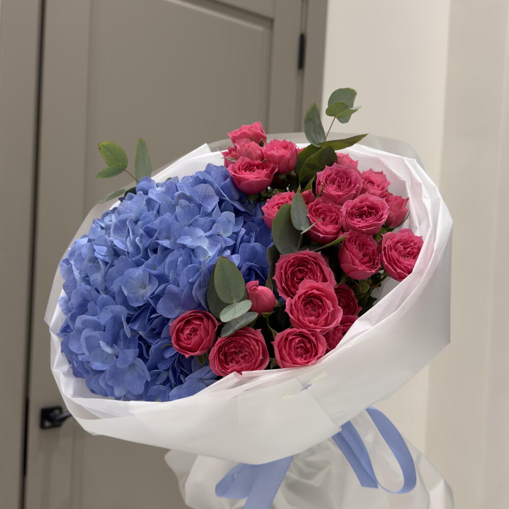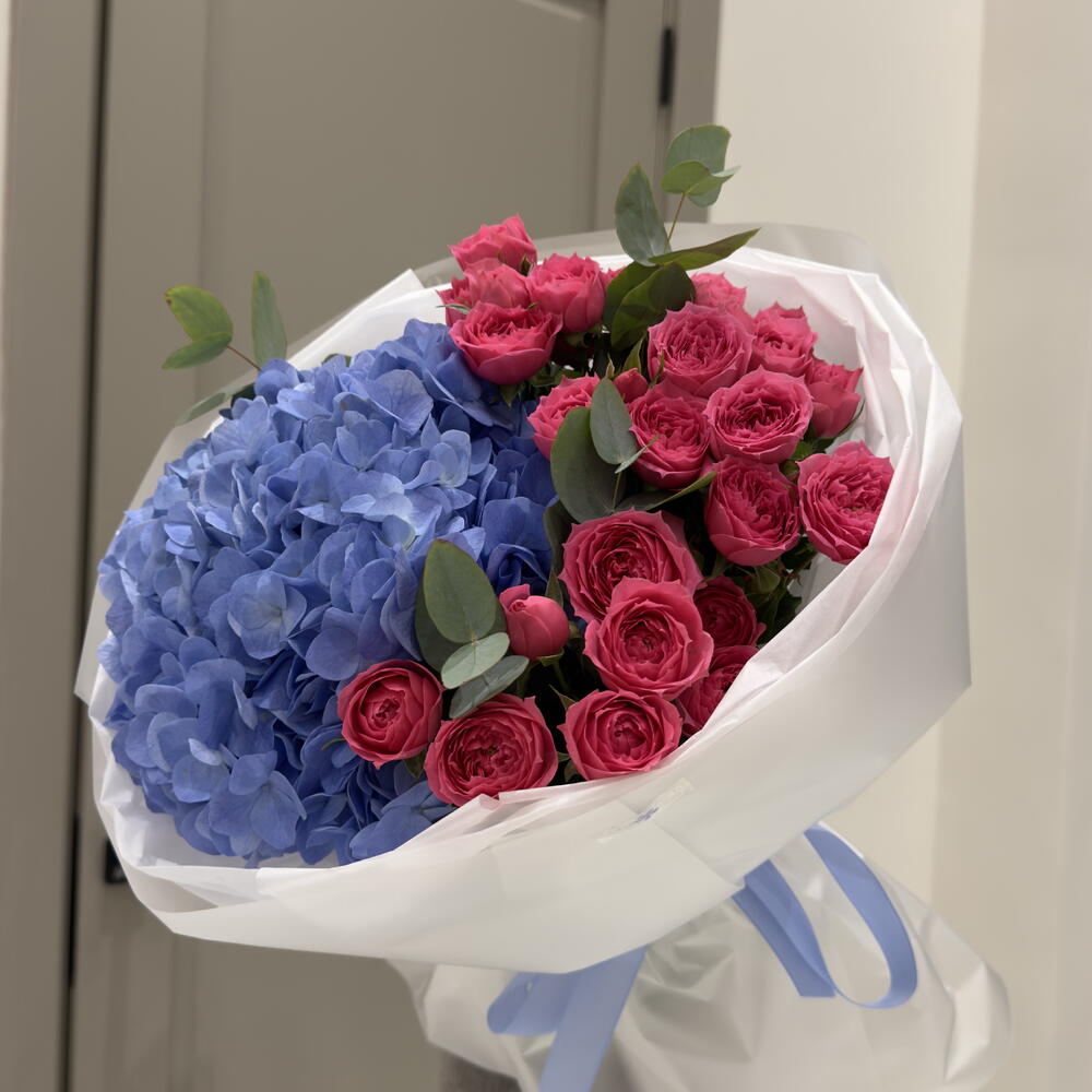 Гортензия - 1 шт. Эвкалипт Цинерея - 3 шт. кустовые розы - 5 шт.