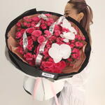 Этот букет — воплощение страсти и элегантности. Сочные розовые кустовые розы создают пышное цветочное облако, которое выглядит роскошно и выразительно. Белоснежные орхидеи фаленопсис добавляют в композицию изысканности и утончённости, подчеркивая контраст нежности и яркости. Такой букет станет идеальным подарком для признания в чувствах, для важного торжества или особого события, где нужны яркие эмоции и роскошный акцент. Рекомендации по уходу: перед установкой букета в вазу обновите срезы стеблей на 1–2 см под углом. Вода должна быть прохладной, менять её рекомендуется каждые 1–2 дня. Держите букет в прохладном месте, избегайте прямых солнечных лучей и сквозняков. Для орхидей важно сохранять достаточную влажность, поэтому можно слегка опрыскивать их лепестки водой.