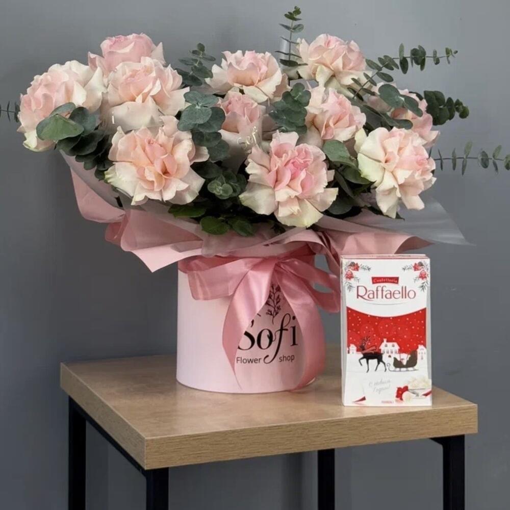 Подарите радость и улыбку с нашим уникальным комбо. Мы продумали все за вас. Представляем вам идеальное сочетание для любого праздника или особенного момента. Комбо композиция из 11 роз и эвкалипта + сладости Raffaello Закажите сейчас и порадуйте своих близких! Открытка и кризал в подарок