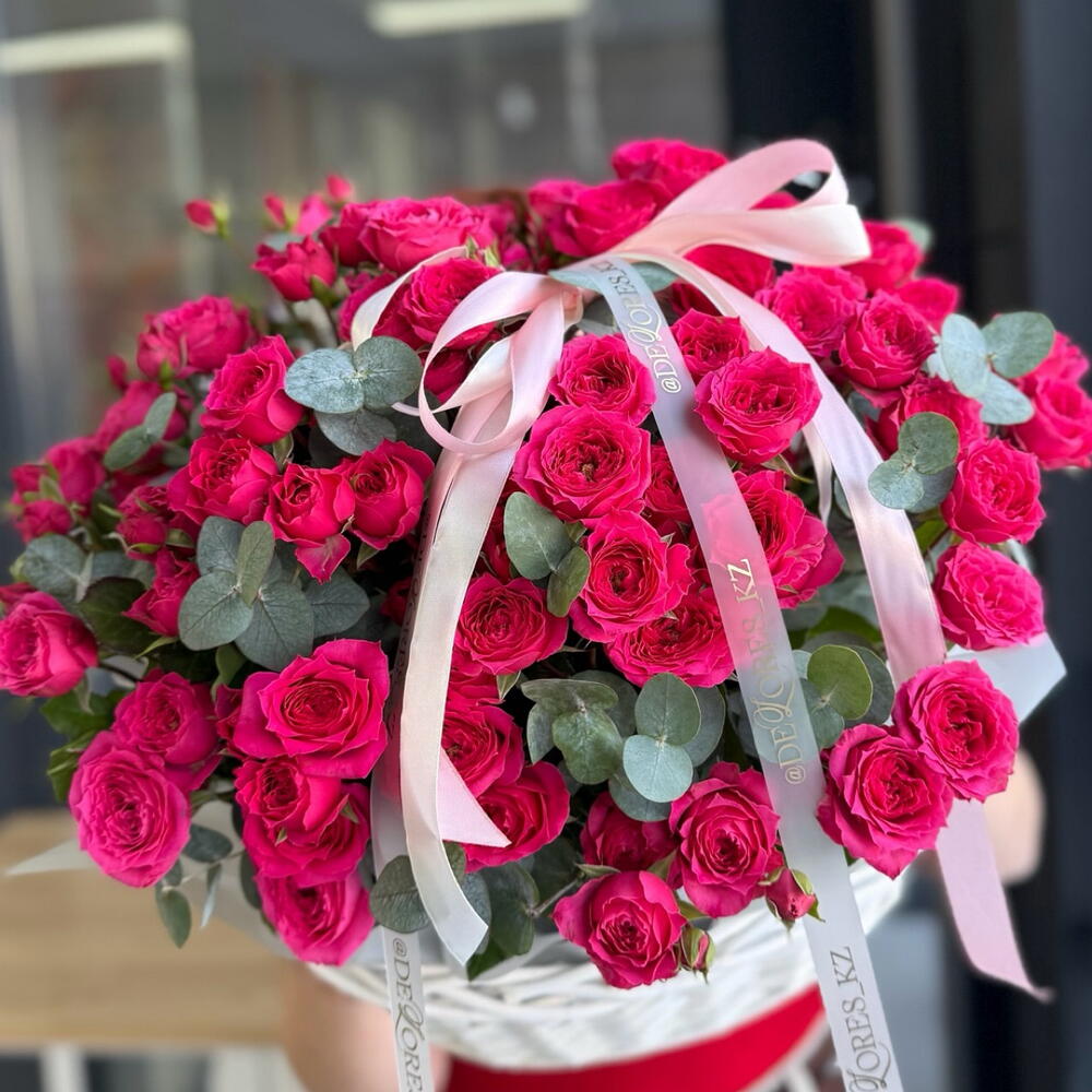 Кустовая роза - 11 шт. Корзина плетеная - 1 шт. Эвкалипт Цинерея - 5 шт.