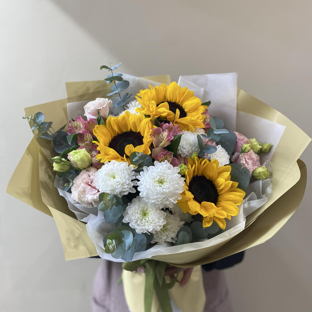 Солнечный подсолнух, белая хризантема и нежные розовые цветы с эвкалиптом в стильной крафтовой упаковке. Тёплый и душевный букет для любого повода.