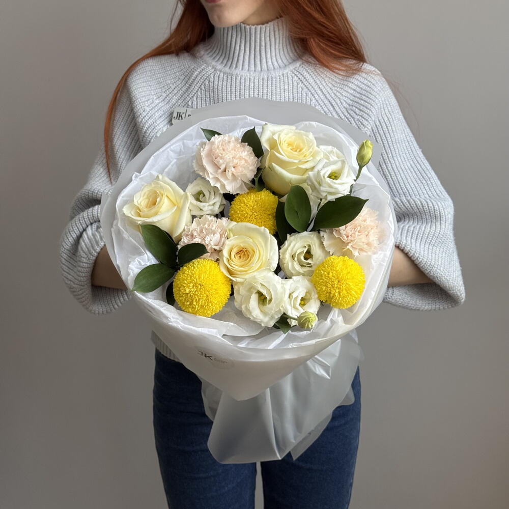 Рускус - 3 шт. Эустома - 3 шт. Пионовидная роза - 3 шт. Диантус сортовой - 3 шт. Хризантема пинг понг - 3 шт.