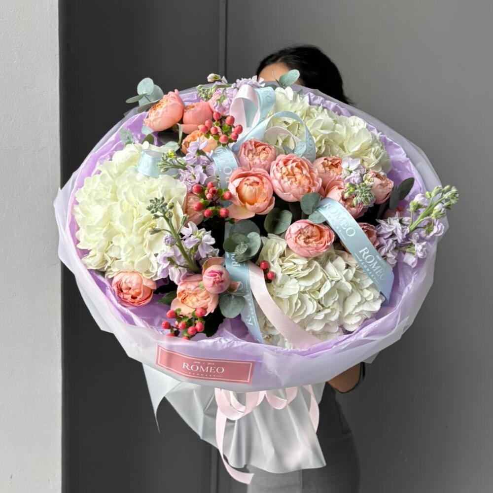 Гиперикум - 2 шт. Гортензия - 3 шт. Лента - 1 шт. Маттиола - 5 шт. Эвкалипт - 1 шт. Спрей - 5 шт. Оформление - 1 шт.