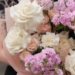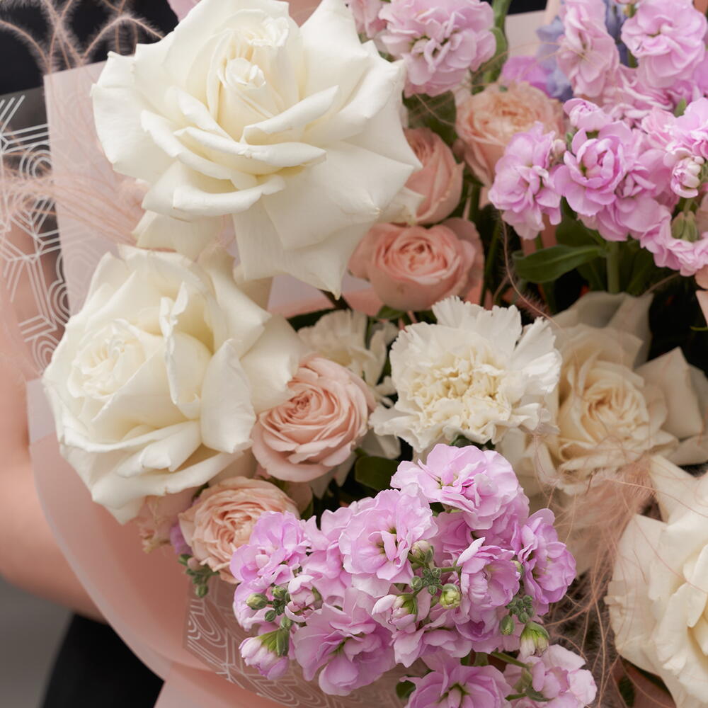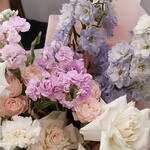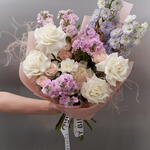 Дельфиниум - 2 шт. Маттиола - 3 шт. Роза кустовая - 3 шт. Роза Эквадор - 5 шт. Диантус - 3 шт. Стифа - 3 шт.