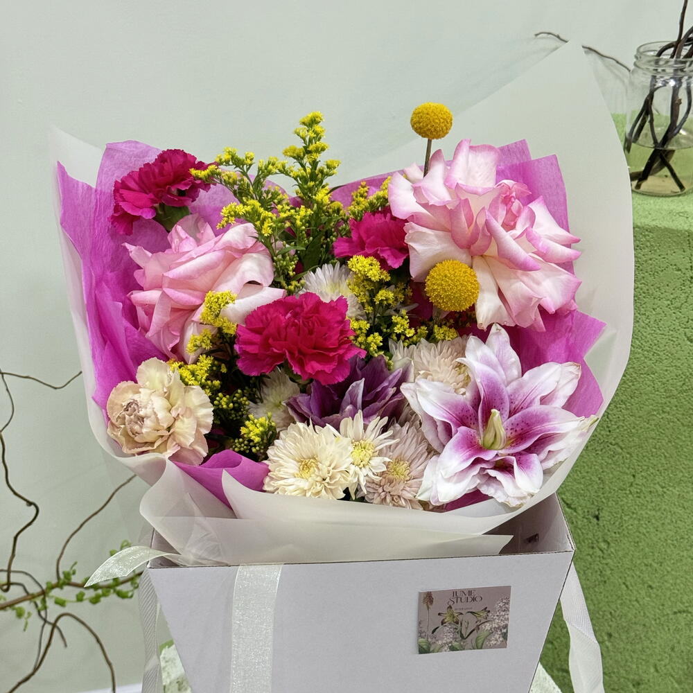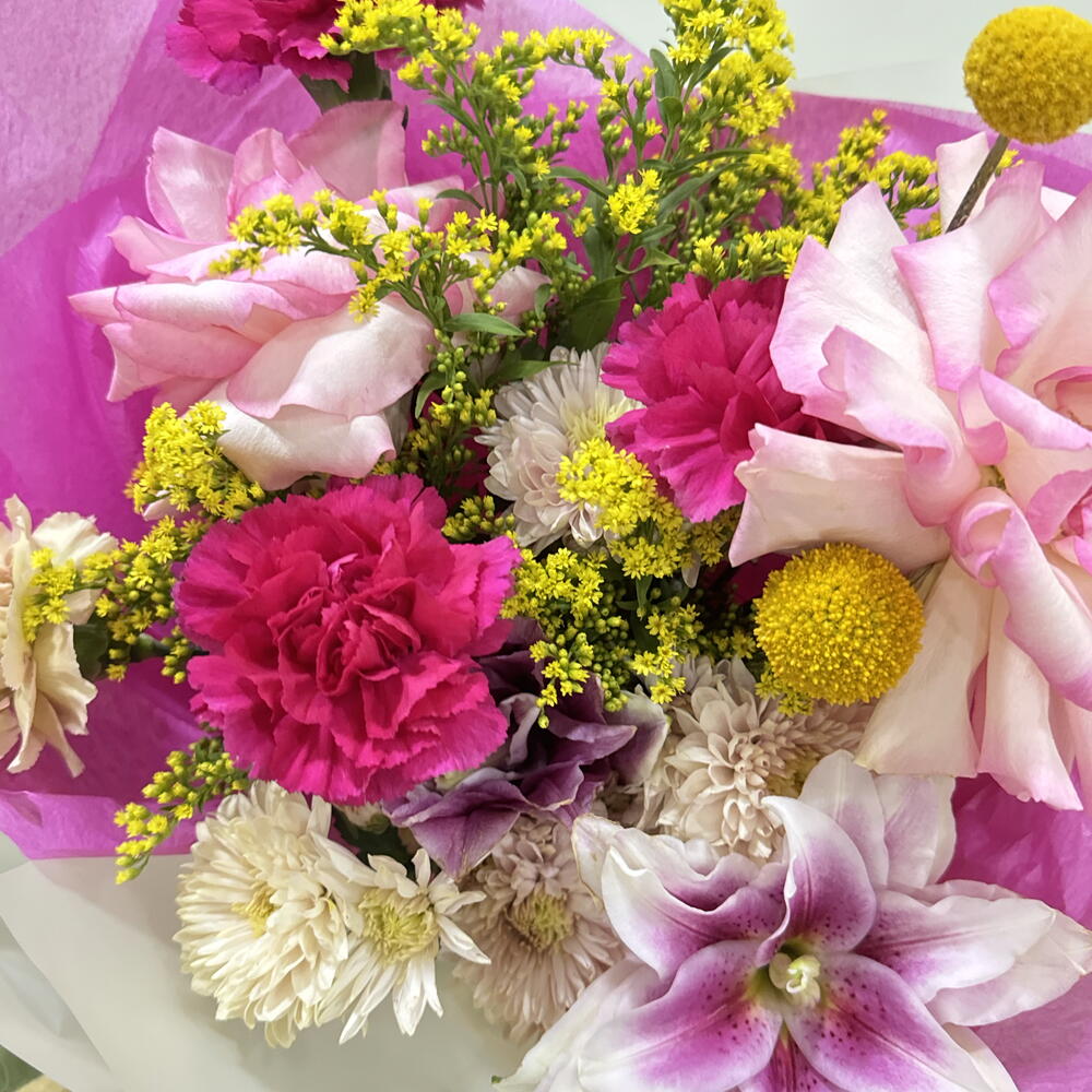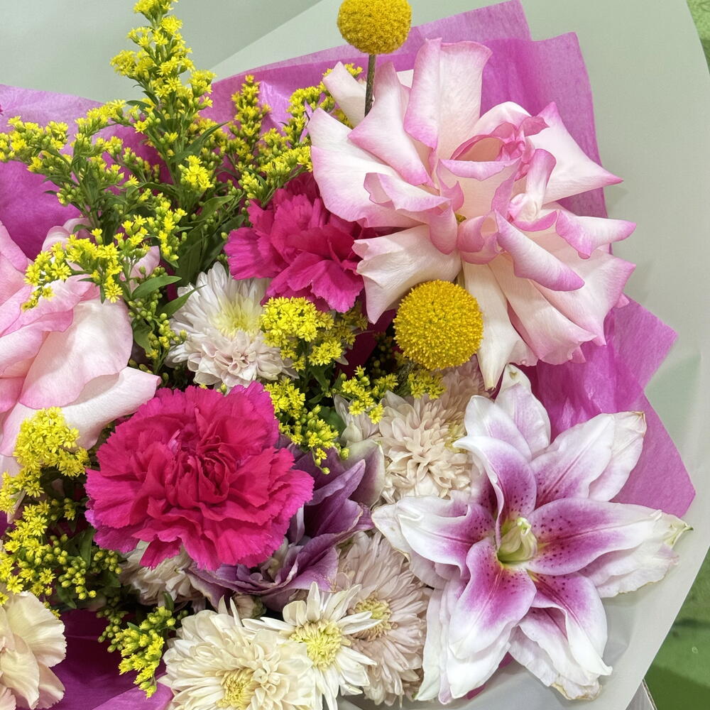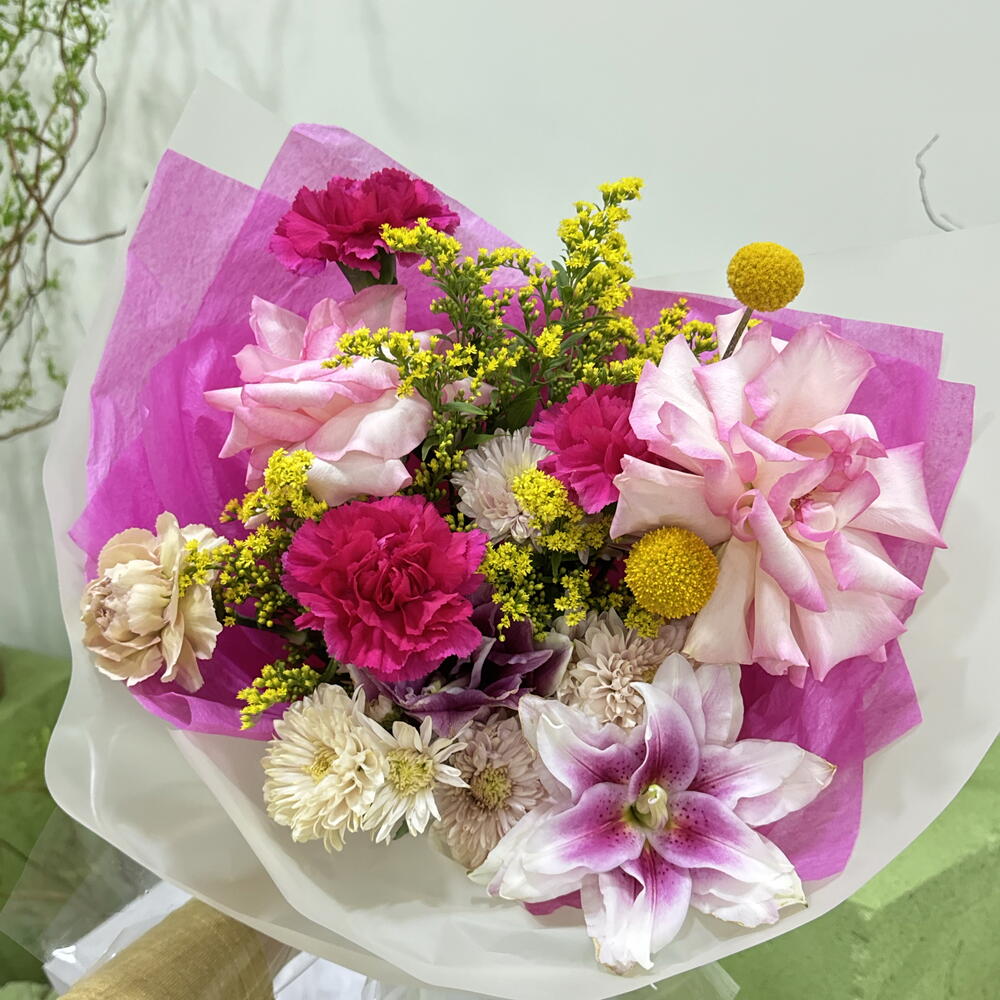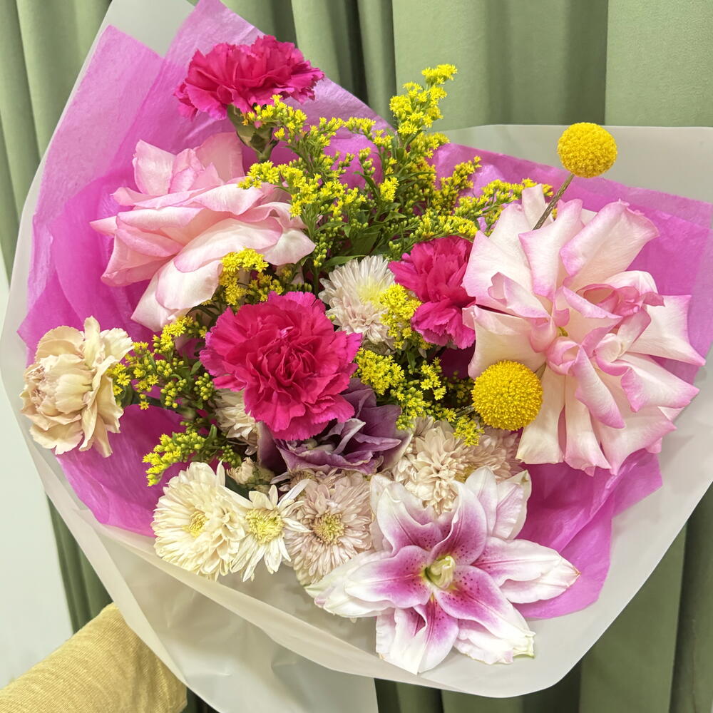 Chrysanthemum - 3 шт. dianthus - 4 шт. craspedia - 2 шт. solidago yellow - 3 шт. rose esperance - 2 шт. lily peony - 1 шт.