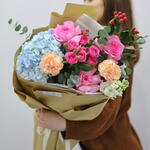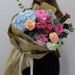 Гиперикум - 1 шт. Гортензия - 1 шт. Маттиола - 1 шт. Эвкалипт - 5 шт. Роза - 3 шт. Кустовая роза - 1 шт. Диантус - 2 шт.
