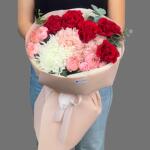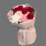 Гортензия - 1 шт. Эвкалипт - 1 шт. Хризантема одноголовая - 1 шт. кустовая роза джульетта - 2 шт. розы - 5 шт. аква бумага - 1 шт.