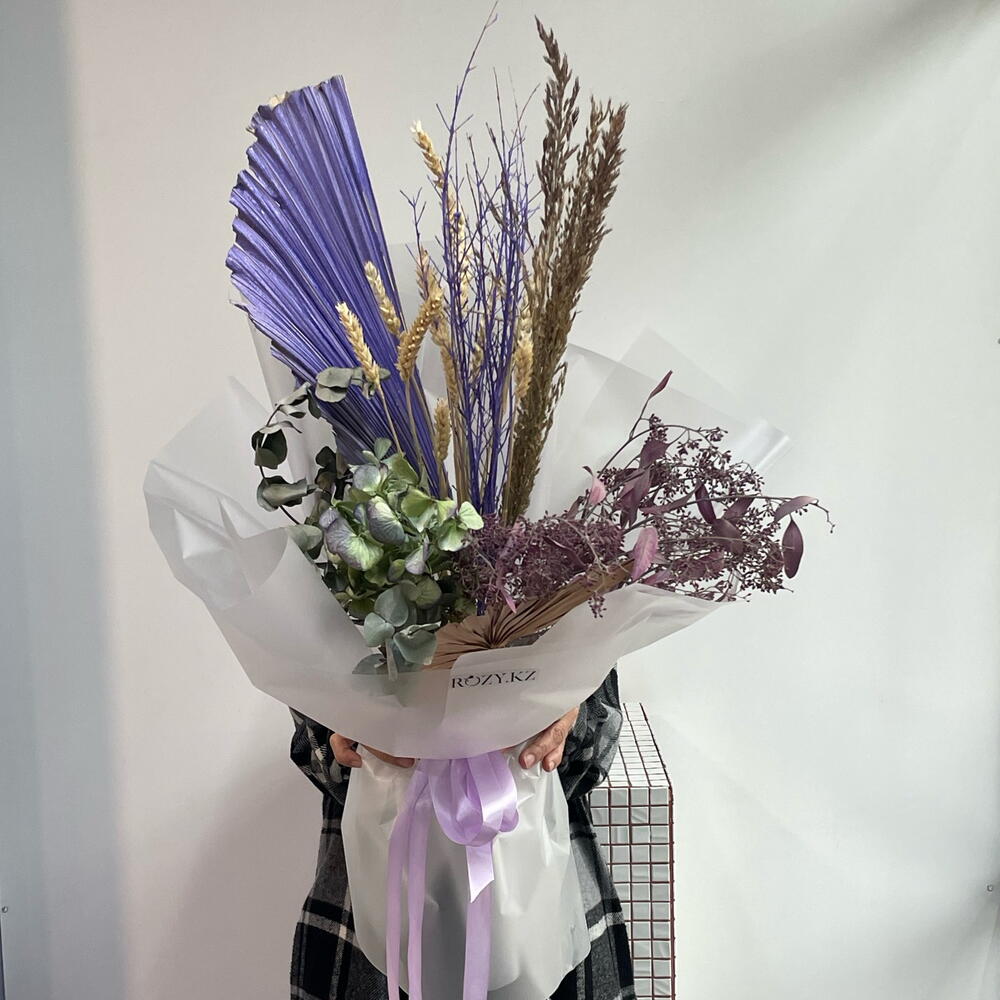 Пшеница - 11 шт. Лист пальмы - 1 шт. Эвкалипт стабилизированный - 2 шт. гортензия сухоцвет - 1 шт. сухие ветки - 3 шт. лист пальмы крашеный - 1 шт. пампас сетария - 3 шт. упаковка 1.5 - 1 шт.