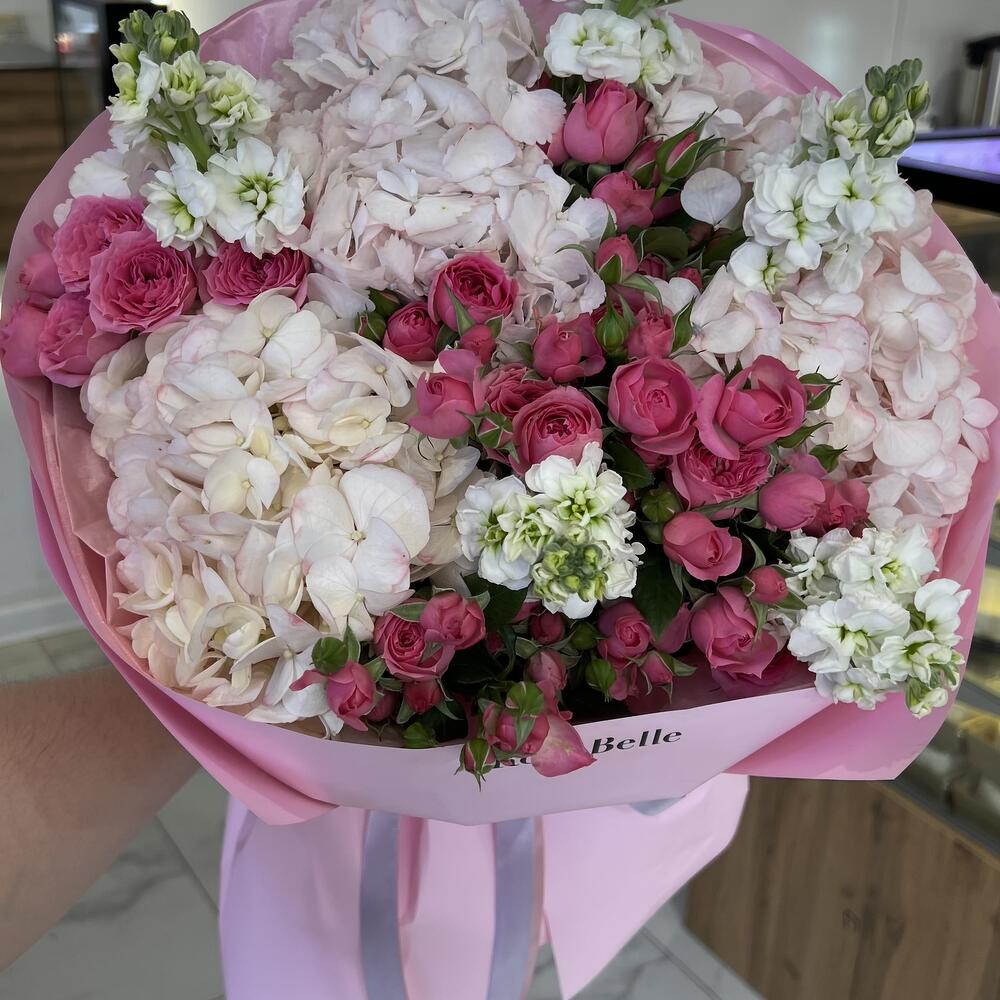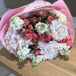 Стильный сборный букет, евробукет который выбирают ценители стиля, шикарный состав букета из гортензии, кустовых роз и ароматной маттиолы создает гармоничный букет для любителей цветов!