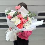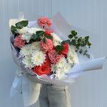 Хризантема кустовая - 5 шт. Роза - 5 шт. Диантус - 4 шт. Эвкалипт Baby Blue - 2 шт.