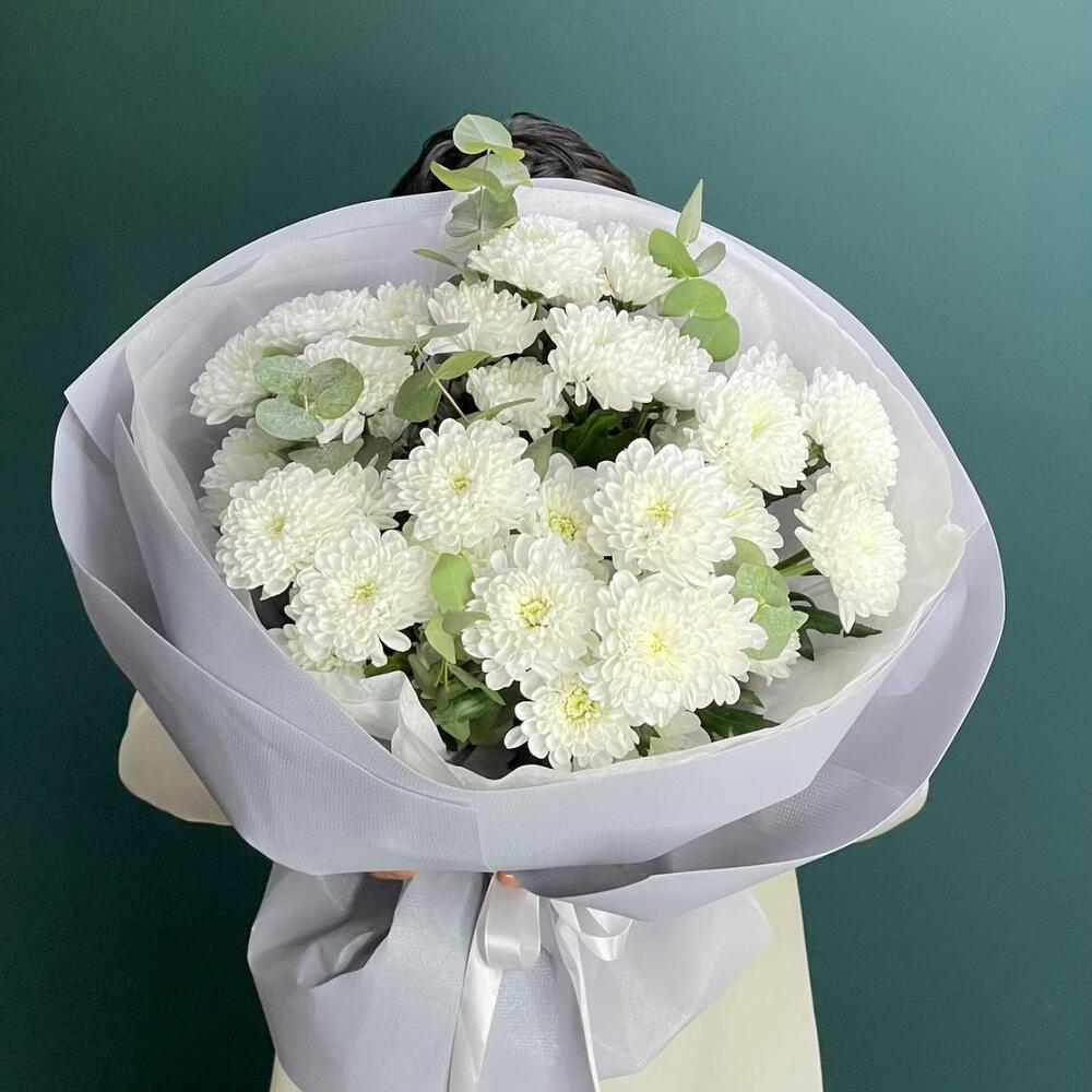 Хризантема кустовая - 5 шт. Эвкалипт - 1 шт. Оформление - 4 шт.