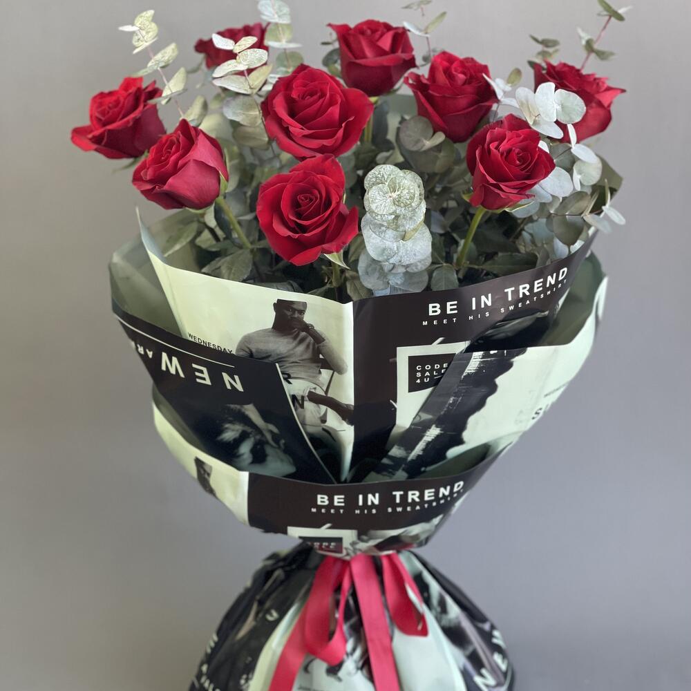 Роскошный букет из бордовых роз премиального качества с веточками эфкалипта. Будет отличным подарком к любому празднику или признанию в любви девушке, женщине, бабушке, маме. Наша бережная доставка быстро привезёт букет к любому мероприятию.