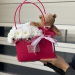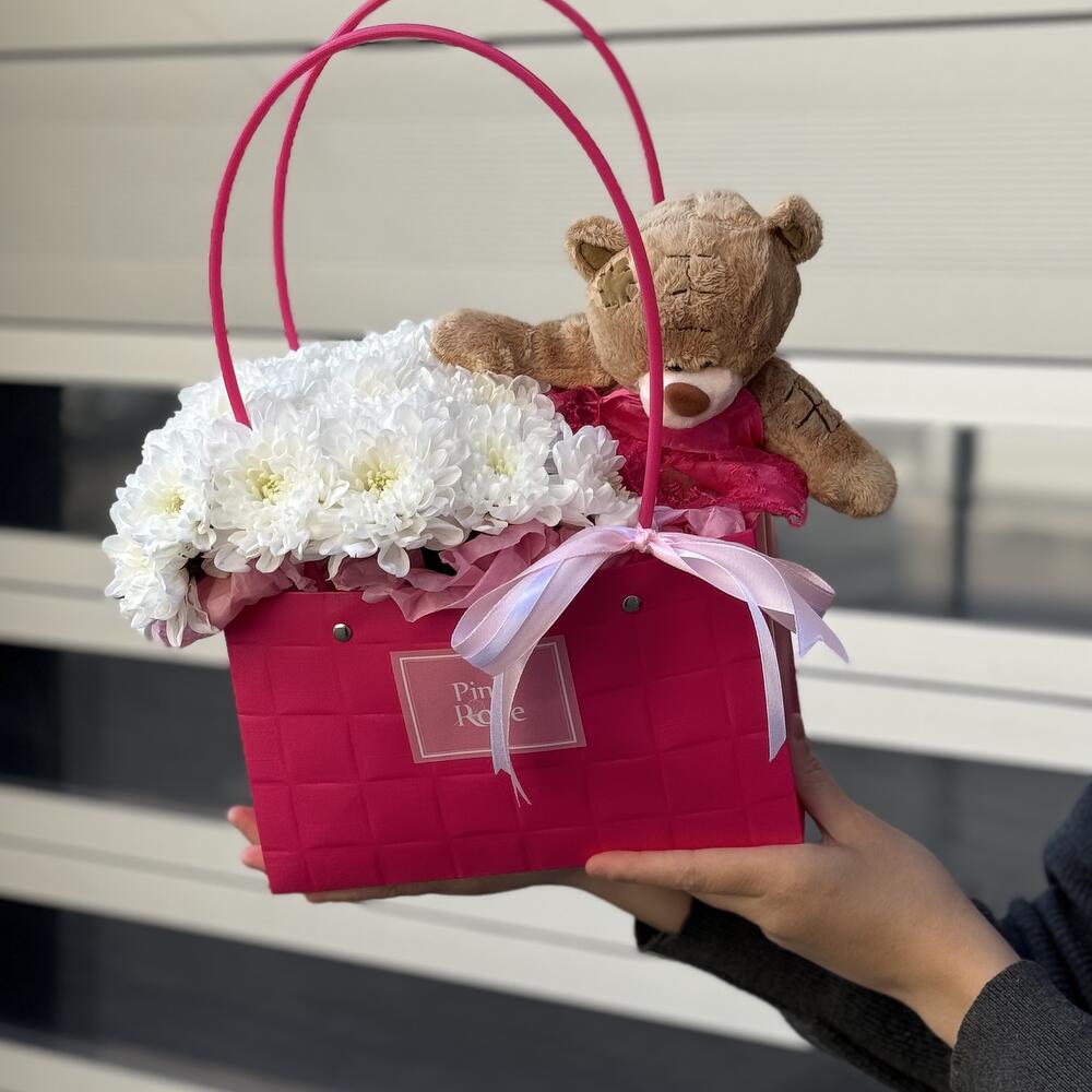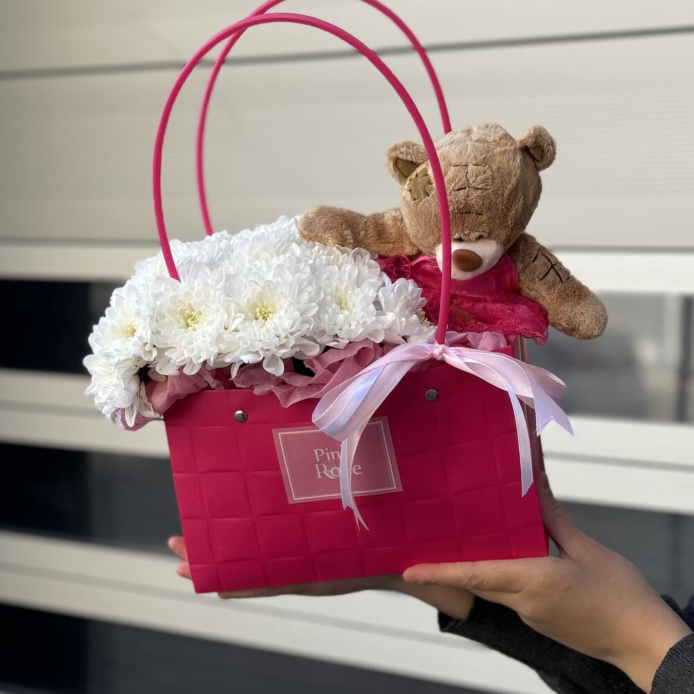 Хризантема кустовая - 8 шт. Мишка плюшевый - 1 шт.