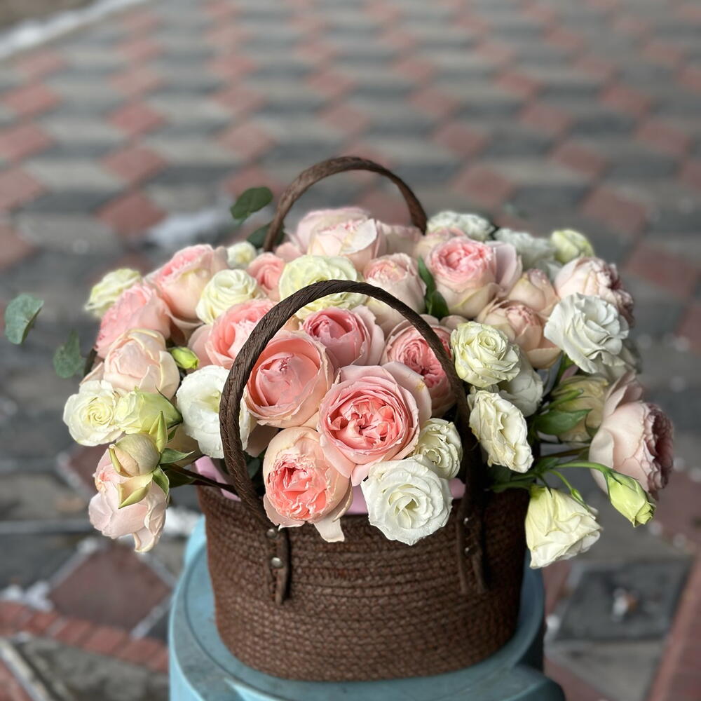 Сумка с лизиантусами и спрей розой