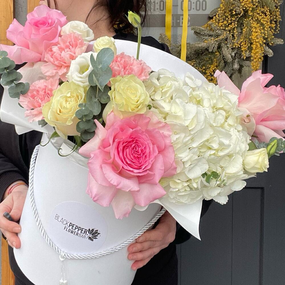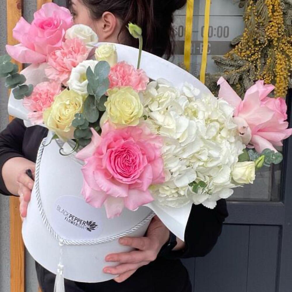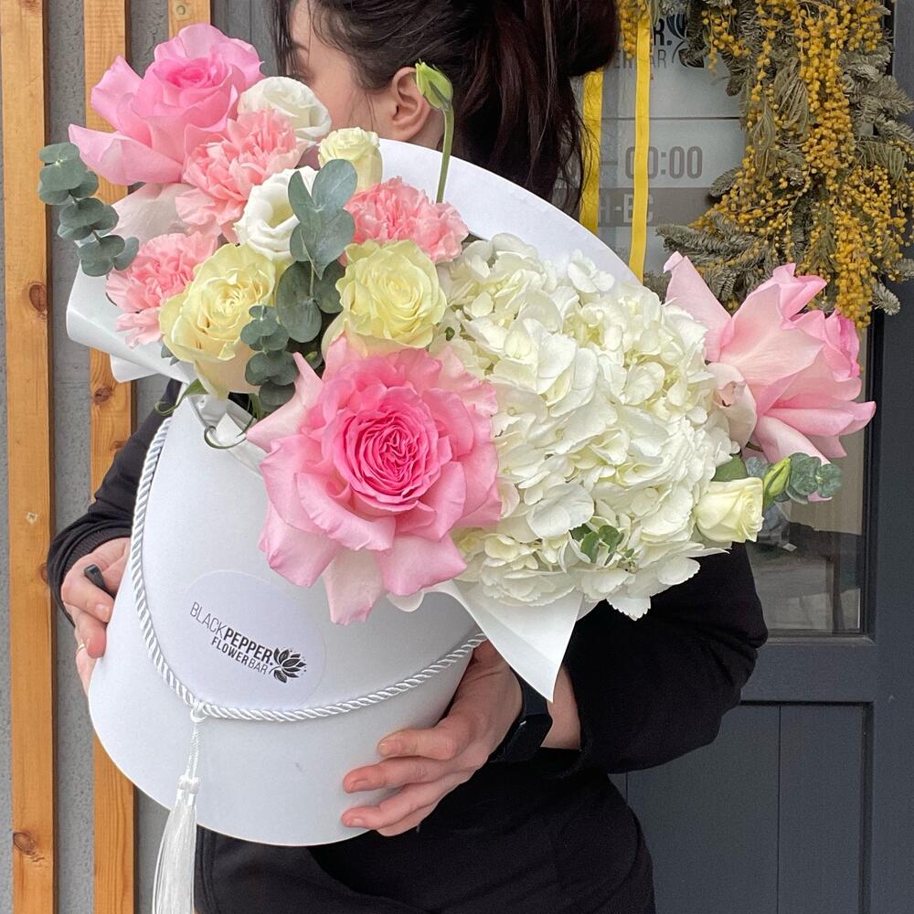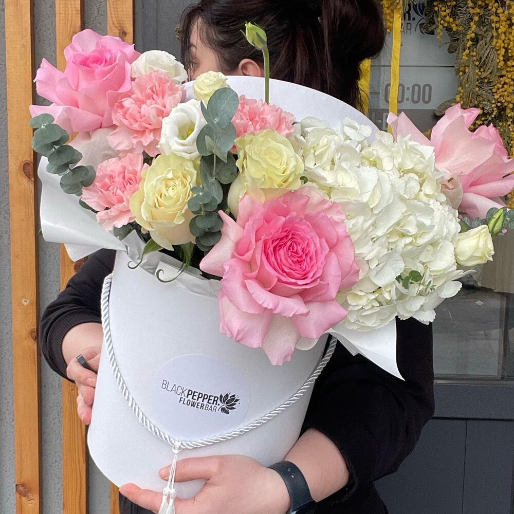 Окунитесь в мир элегантности и роскоши с этим изысканным комплектом цветов, аккуратно уложенных в стильную коробку. Он включает в себя пышную гортензию, окруженную изящными розами, комплектуется нежной эустомой и благоухающими цветами диантуса. Изумрудный блик придает пара сочных ветвей эвкалипта микс. Этот набор идеально подойдет для того, чтобы выразить свои чувства, поздравить с праздником или просто порадовать любимого человека.